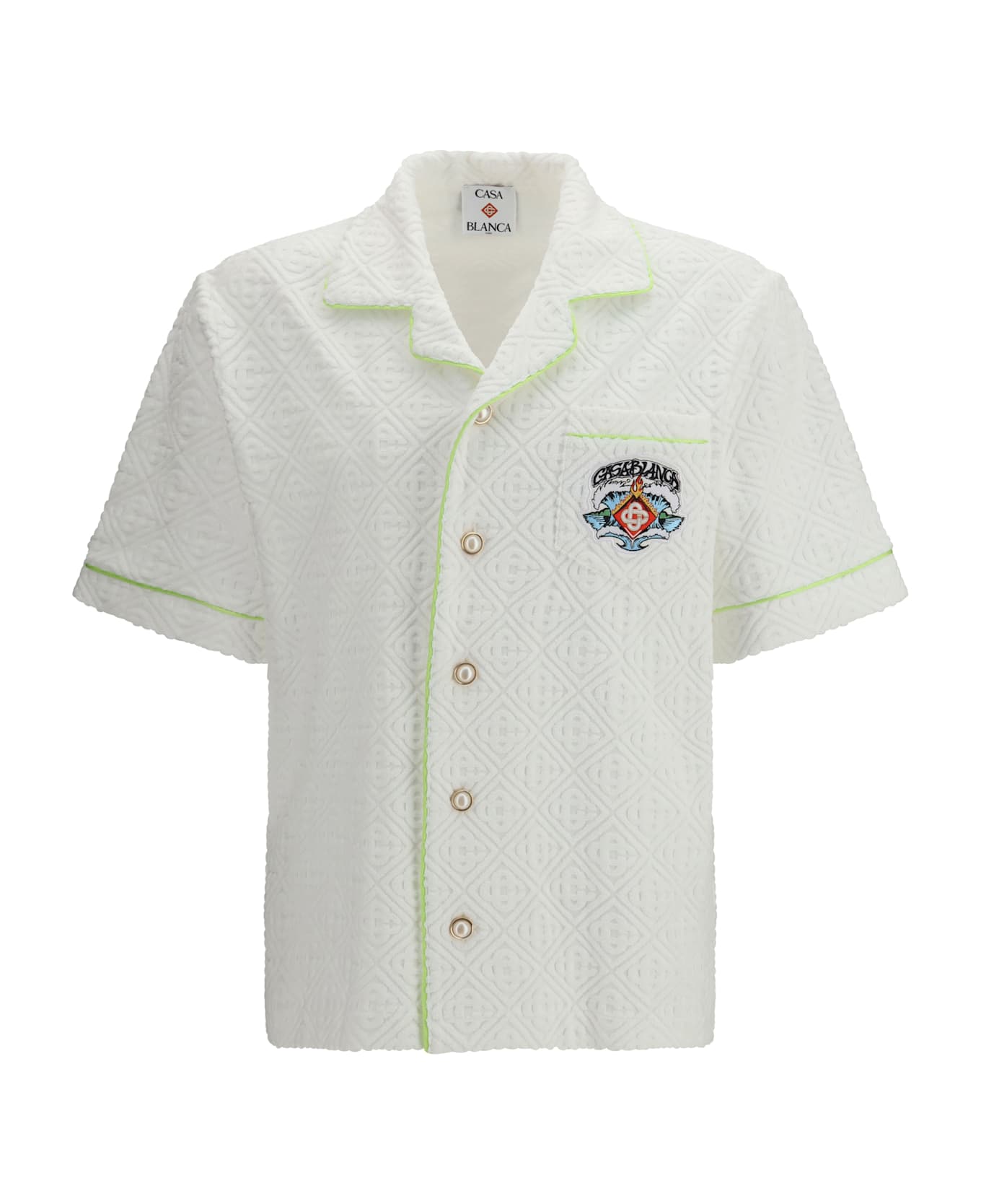 The polo shirt by casablanca is an elegant and refined garment, featuring a distinctive monogram that enriches the design. the chest pocket adds a touch of practicality, while the button closure and short sleeves give it a clean and versatile silhouette. the embroidered logo on the chest discreetly highlights the brand's identity, making this polo shirt perfect for a casual-chic look, suitable for a variety of occasions.