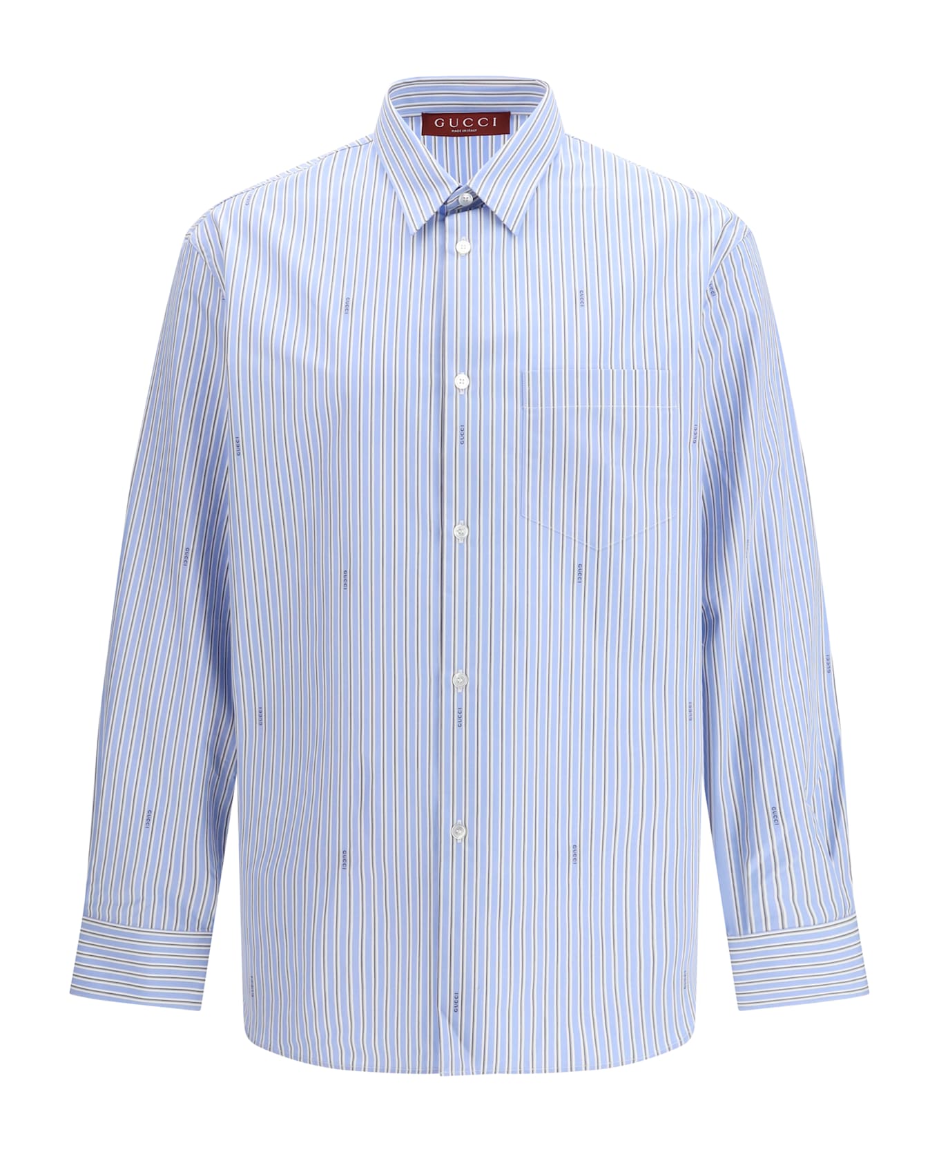 The striped cotton poplin shirt by gucci is crafted from light blue striped cotton poplin with a gucci fil coupé detail. the main fabric is made from 100% certified cotton, grown in california by a sixth-generation family-owned farm that embraces regenerative agricultural practices focused on water conservation, soil health, biodiversity, energy efficiency, and responsible labour standards. designed with a point collar, a chest pocket, a front button closure, and a regular fit, it combines refined craftsmanship with a timeless silhouette.