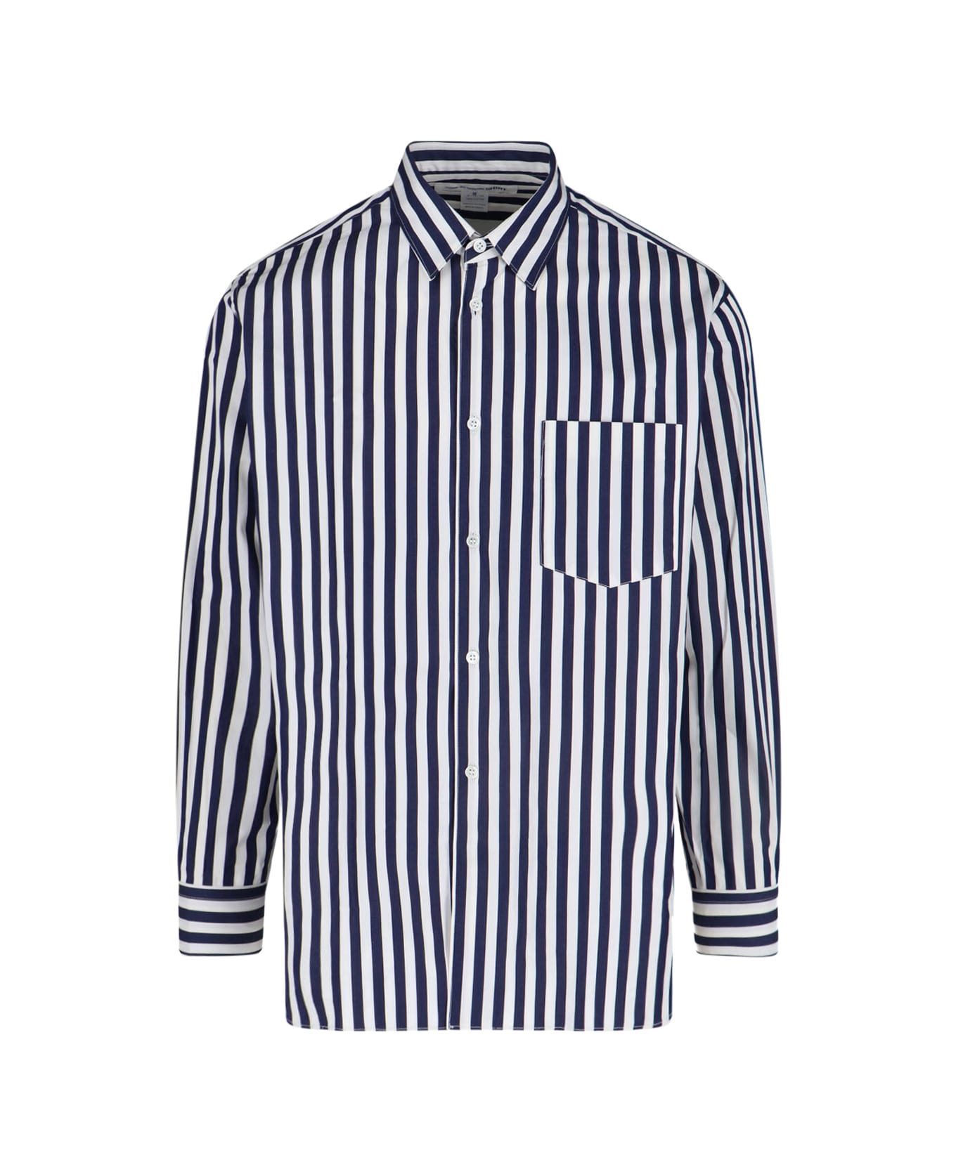 Comme des Garçons shirt in blue cotton with white striped pattern, classic collar, button closure, chest pocket, button cuffs, curved hem. Composition: 100% Cotton