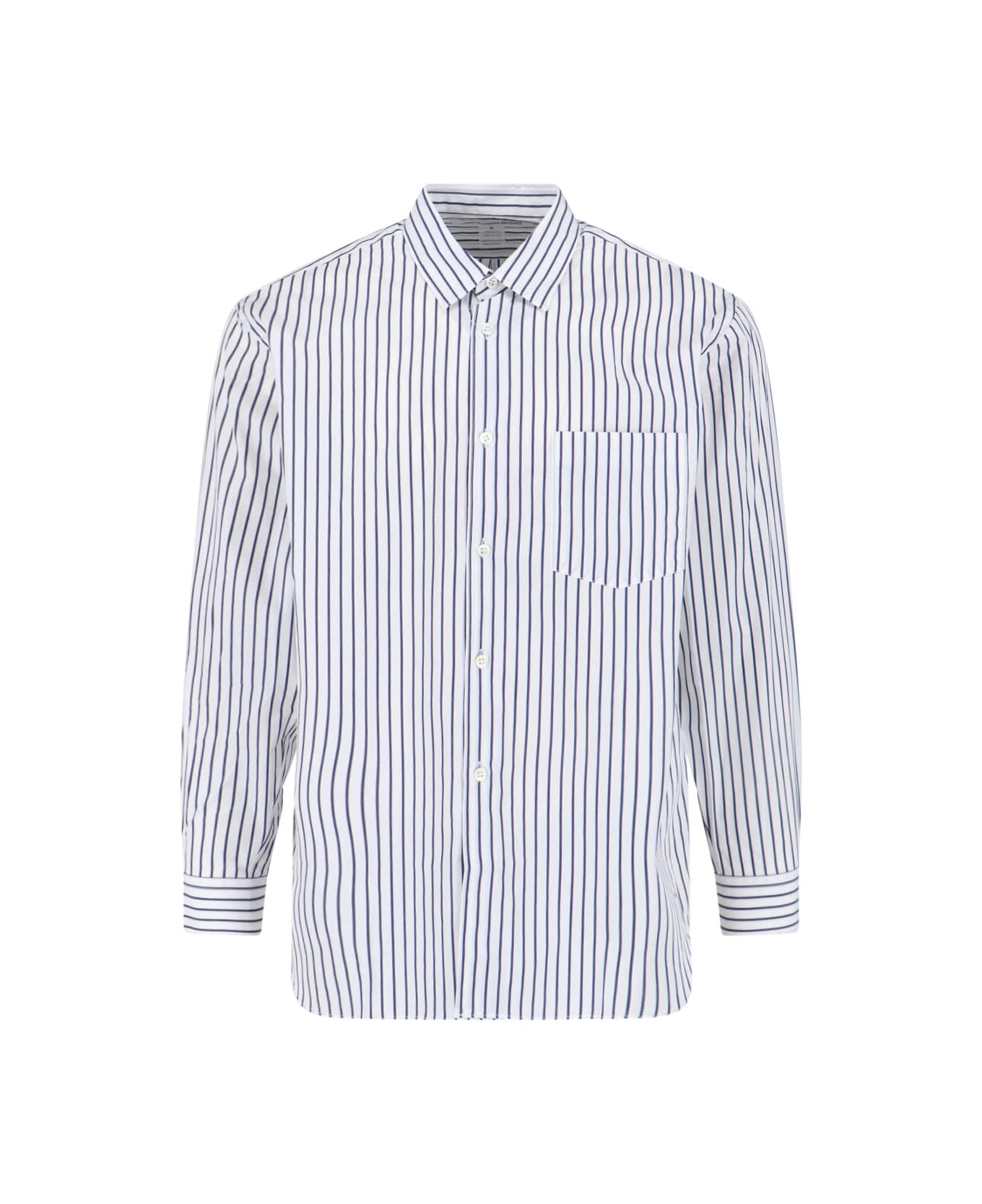 Comme Des Garcons shirt in white cotton with blue striped pattern, classic collar, button closure, front pocket, button cuffs, straight hem. Composition: 100% Cotton