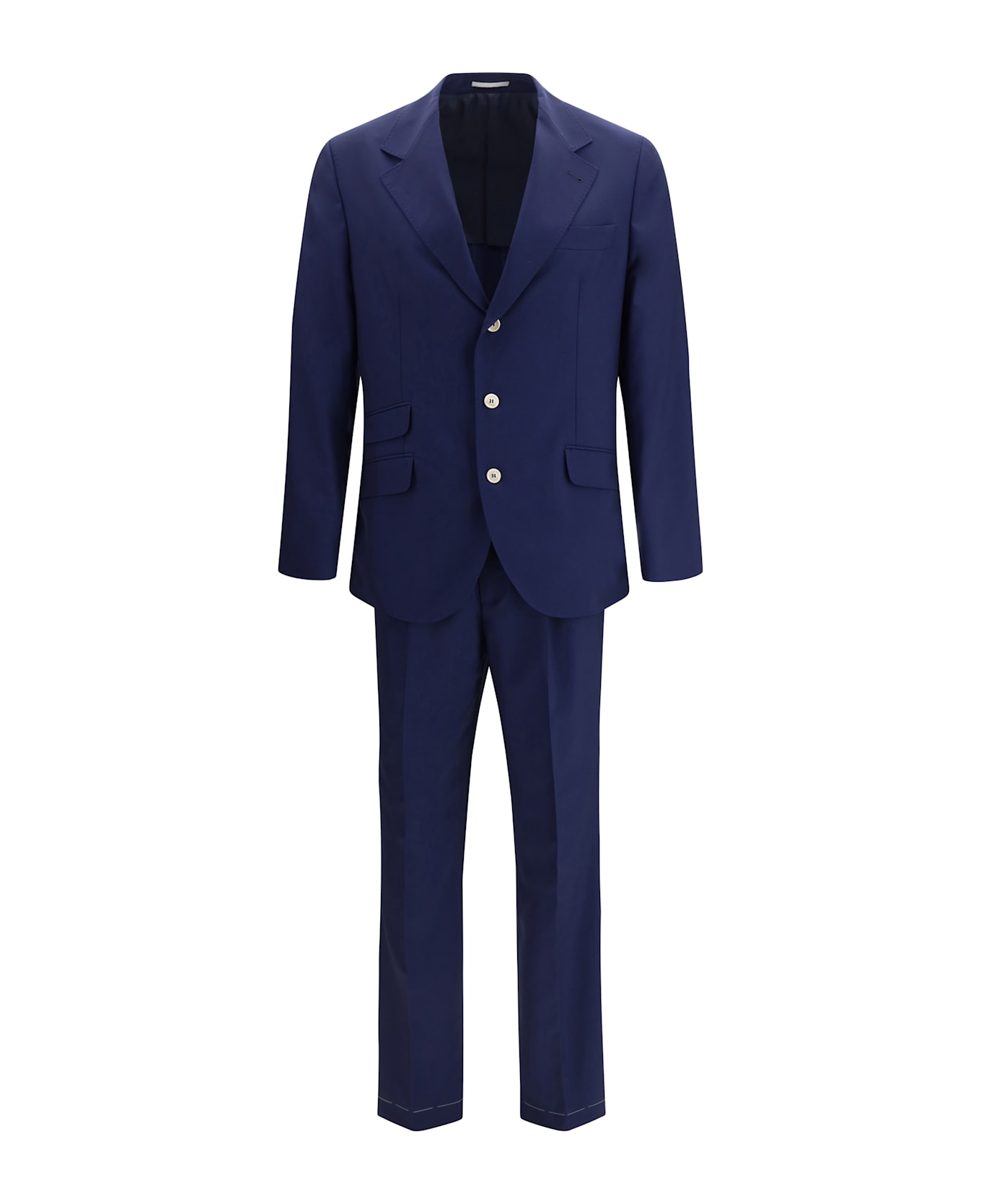 The single-breasted suit with peak lapels by brunello cucinelli embodies timeless tailored elegance. the jacket features button fastening, flap pockets and buttoned cuffs enhancing its classic structure, while the trousers with front pleats complete the look with fluid lines and refined proportions. a sophisticated ensemble designed for impeccable contemporary style. Composition: 100% % Fleece Wool Ovis Aries