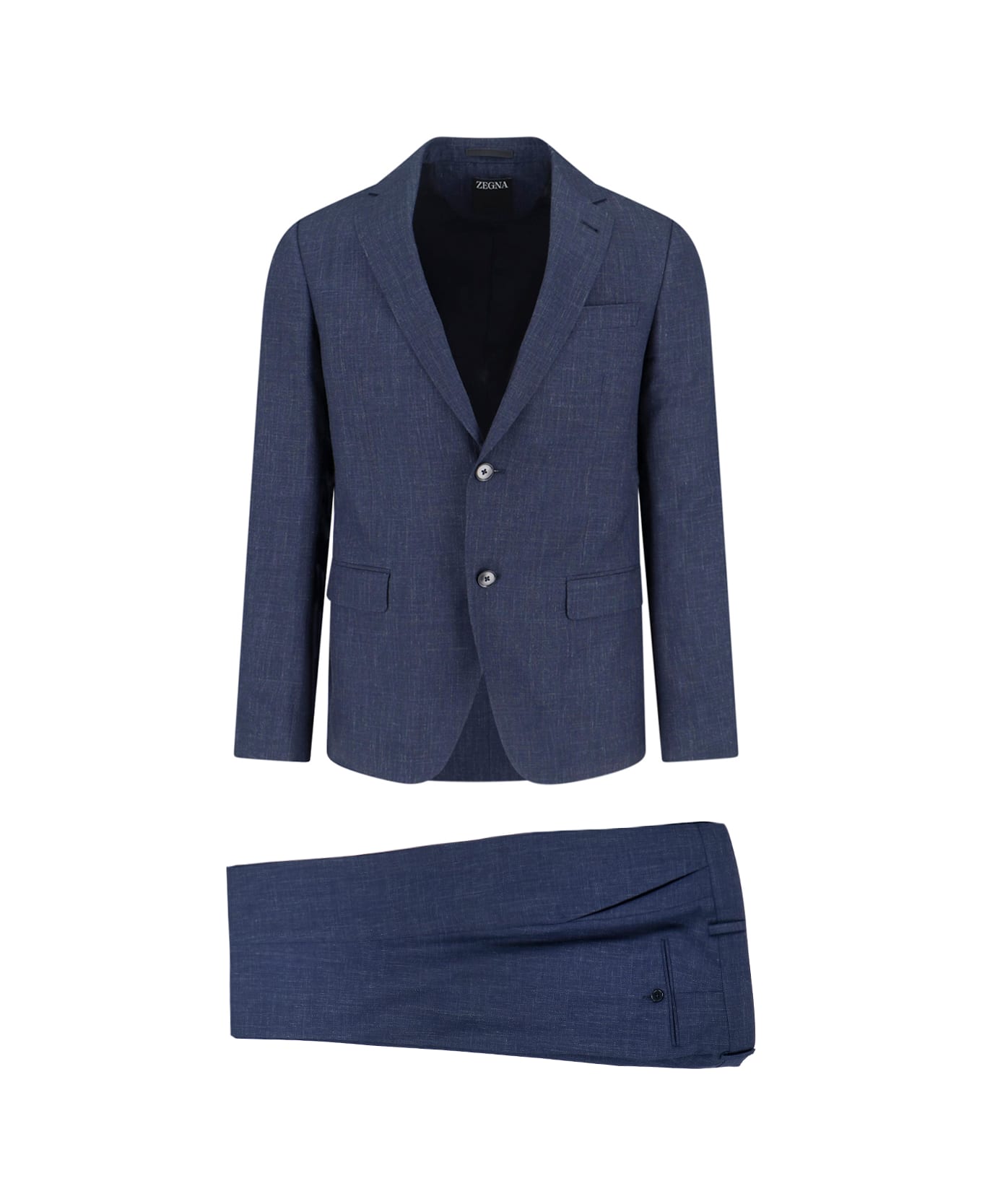 Zegna single-breasted suit in navy wool and linen with classic lapels, single-breasted button closure on the front, two front welt pockets, chest flap pocket, cuffs with buttons, logo label on the sleeve, tailored trousers, button and zip closure, belt loops, front pin tucks, two back welt pockets, straight leg. Composition: 91% Wool, 9% Linen