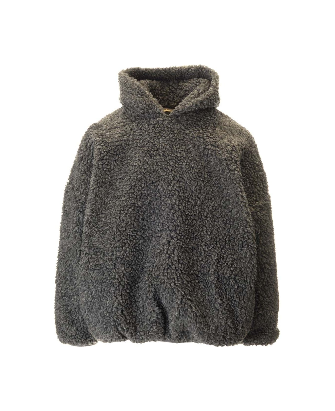 side pockets, piping at the cuff, and waist hem. A leather Fear of God label is stitched on the hood.
