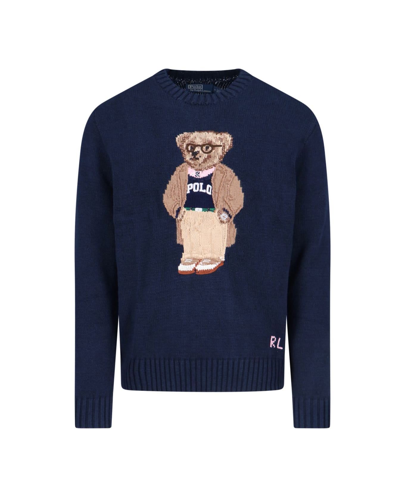 Polo Ralph Lauren blue polo shirt in navy shades Polo Bear with crewneck, maxi multicolor logo intarsia on the chest, ribbed trim, and straight hem.