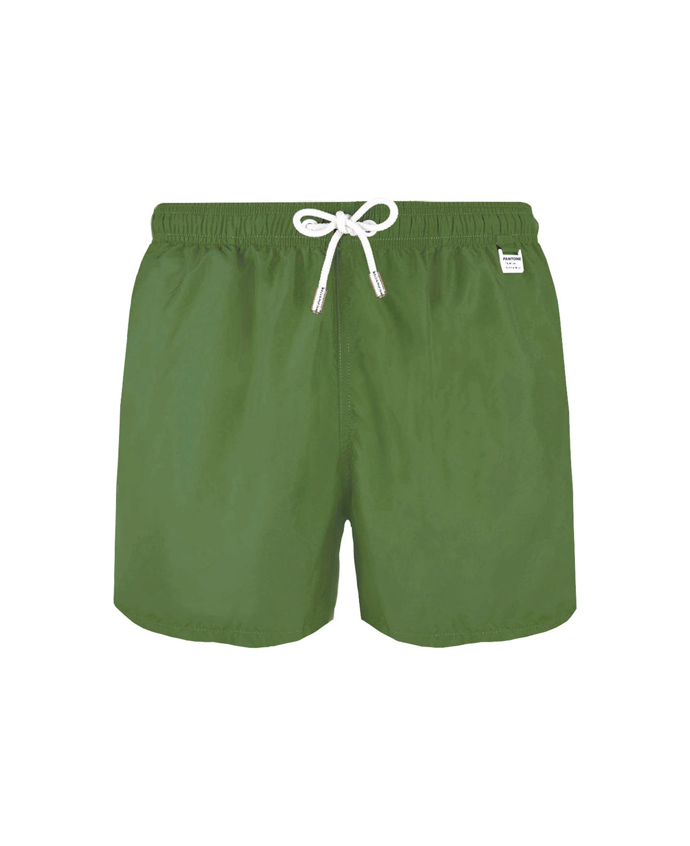 Pantone Solid Color Swim Trunk Unique Edition for MC2 Saint Barth. Ultralight fabric swimshorts for man, military green Pantone solid color, quick drying, mid-length, regular fit, inside ergonomic brief, drawcord closure, pockets on both sides, backside pocket with magnetic closure, front metallic and back rubber Pantone Label. The swim trunk can be folded into the back pocket turning into a perfect travel pouch. Gift money box packaging.