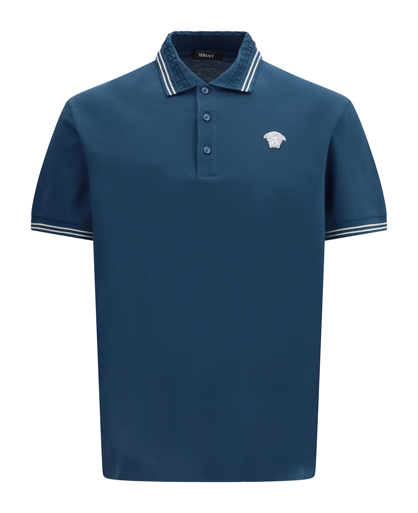 The cotton polo shirt by versace embodies a clean, refined style enhanced by iconic brand details. the classic ribbed collar and tonal front buttons create a sleek and versatile design, while the versace logo patch applied on the front adds a distinctive touch. the regular fit ensures comfort and effortless elegance, making it a perfect everyday staple.