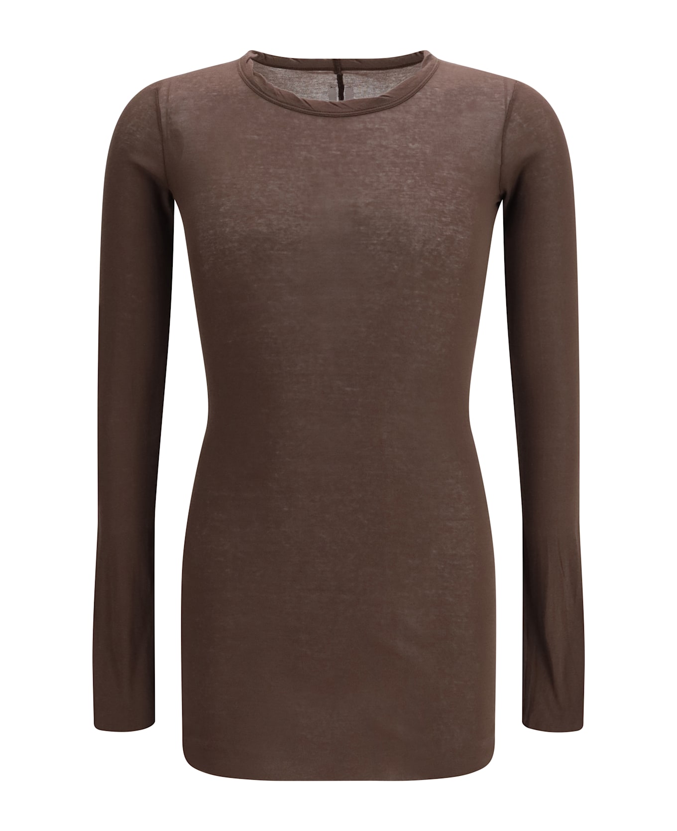 The long-sleeved fitted t-shirt by rick owens is an elegant and bold design featuring a simple crew neck and long sleeves. the fitted cut accentuates the silhouette, creating a modern and sophisticated look. made from high-quality materials, this t-shirt is perfect for those looking for a contemporary take on a basic, which can be worn on its own or as a base for a more structured outfit. an excellent choice for a minimalist yet distinctive look.