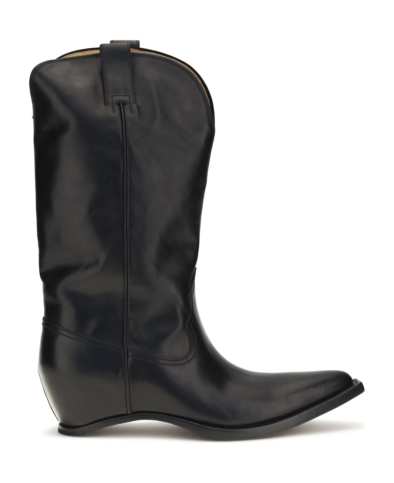 The heel-less western boots by maison margiela reinterpret the classic western style with a bold, contemporary design. featuring a continuous curved sole that incorporates a hidden heel, they boast an upper crafted from treated leather for a distressed look. the tapered toe and clean stitching define an elegant, precise silhouette, while the single white stitch on the back serves as the maison s signature.