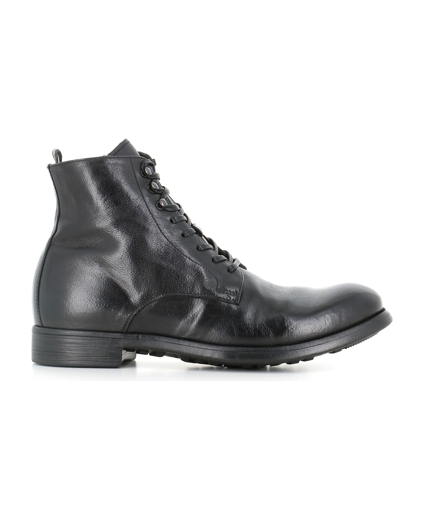 Black leather men's Lace-up Boots by Officine Creative, featuring a square toe, with a double rubber sole and a side zip fastening. Experienced aspects made by to washing treatment. Lined interior. 'Blake' artisan processing. Heel: 3 cm