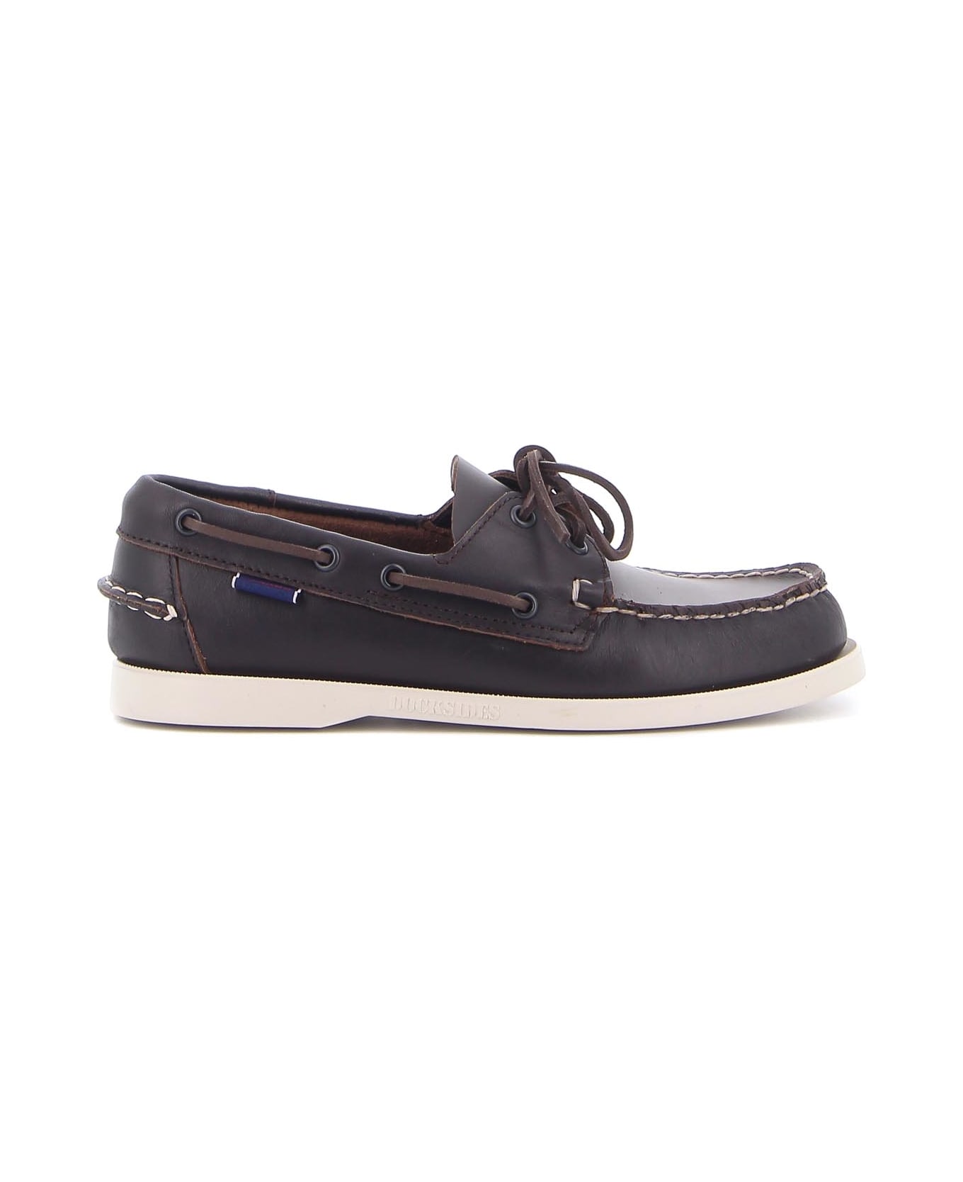 Sebago Brown leather loafer, brown leather laces detail, leather insole, rubber sole, side logo detail.