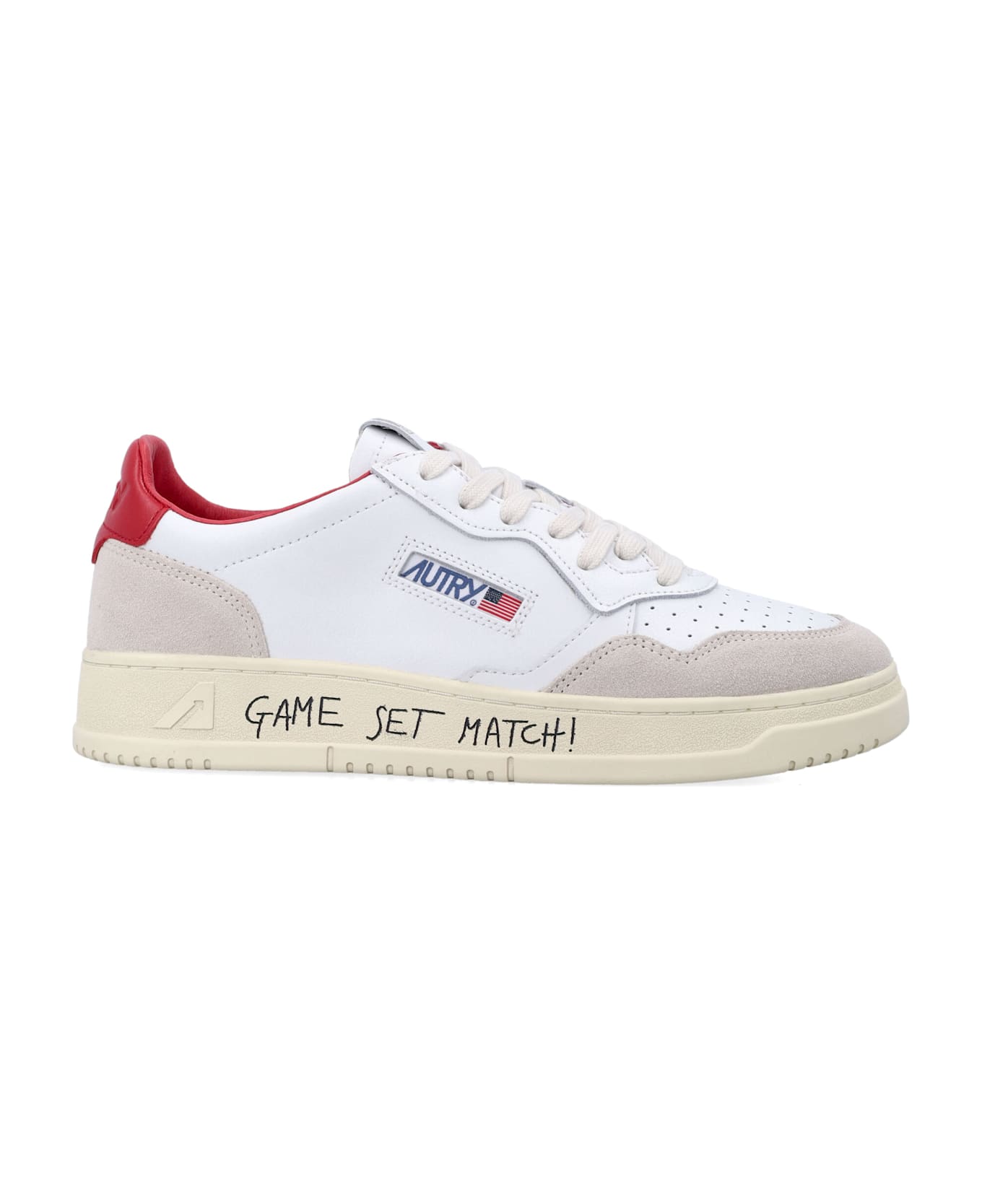 The Autry Medalist Low game Set Match! Sneaker Blends 1980s Tennis Heritage With Modern Style. Crafted From White Leather With Suede Inserts And Red Heel Counter, It Features A Perforated Toe, Padded Ankle Collar, Flat Cotton Laces, And A Rubber Sole Personalized With Graffiti-style Lettering. Perfect For Tennis Enthusiasts Seeking Timeless Style And Everyday Comfort. Includes A Personalized Fabric Shoe Bag. Upper In White Leather And Suede Red Heel Counter Micro-perforated Toe For Breathability Flat Cotton Laces And Padded Ankle Collar Leather And Cotton Terry Lining 2 Cm-high Raised Leather Sockliner Rubber Sole With game Set Match! Lettering Personalized Fabric Shoe Bag Included