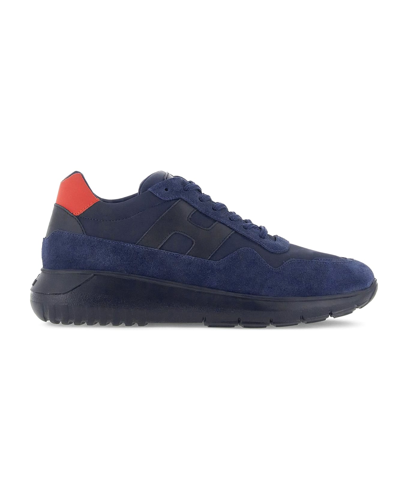 Blue interactive sneakers Suede upper Technical fabric inserts Side H and smooth leather details 8 mm memory foam footbed Rubber sole Total height 5. 3 cm