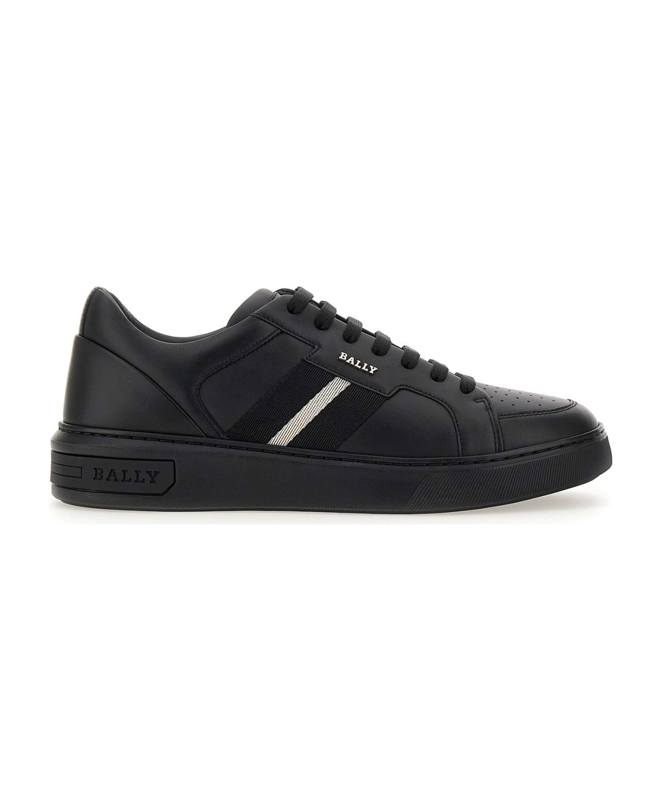 Bally "Moony" men's leather sneakers, black, side white Bally Stripe detail with metal logo, tone-on-tone laces, perforated toe, 4cm high rubber sole with logo.