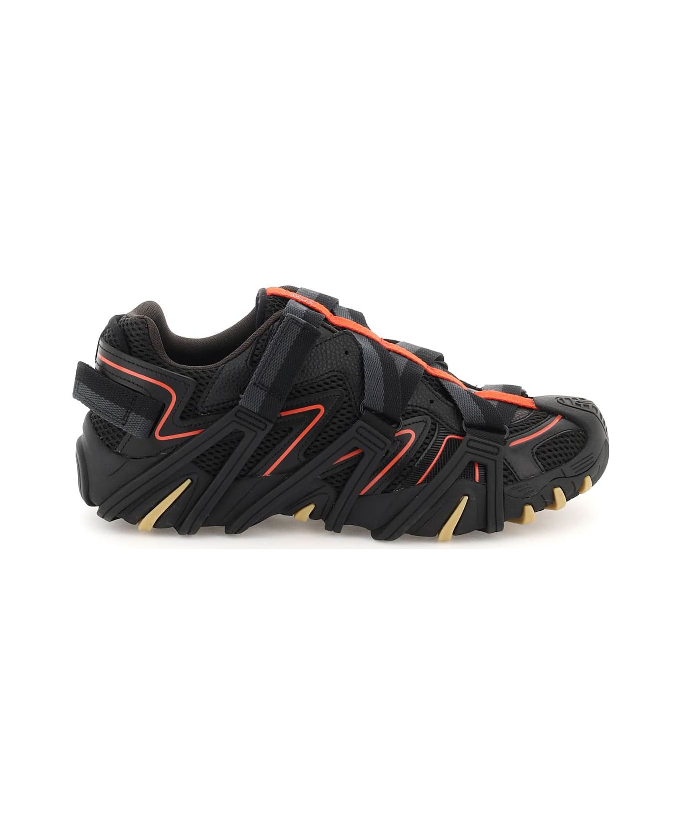 S-Prototype-Cr sneakers by Diesel crafted in mesh fabric with smooth leather applications and grained leather details. The upper is wrapped by an adjustable velcro gros-grain strap attached to the sole by rubber inserts with lacquered metal eyelets. Adjustable velcro strap on the back, lettering logo print on the tongue and on the back, technical fabric lining, rubber sole.