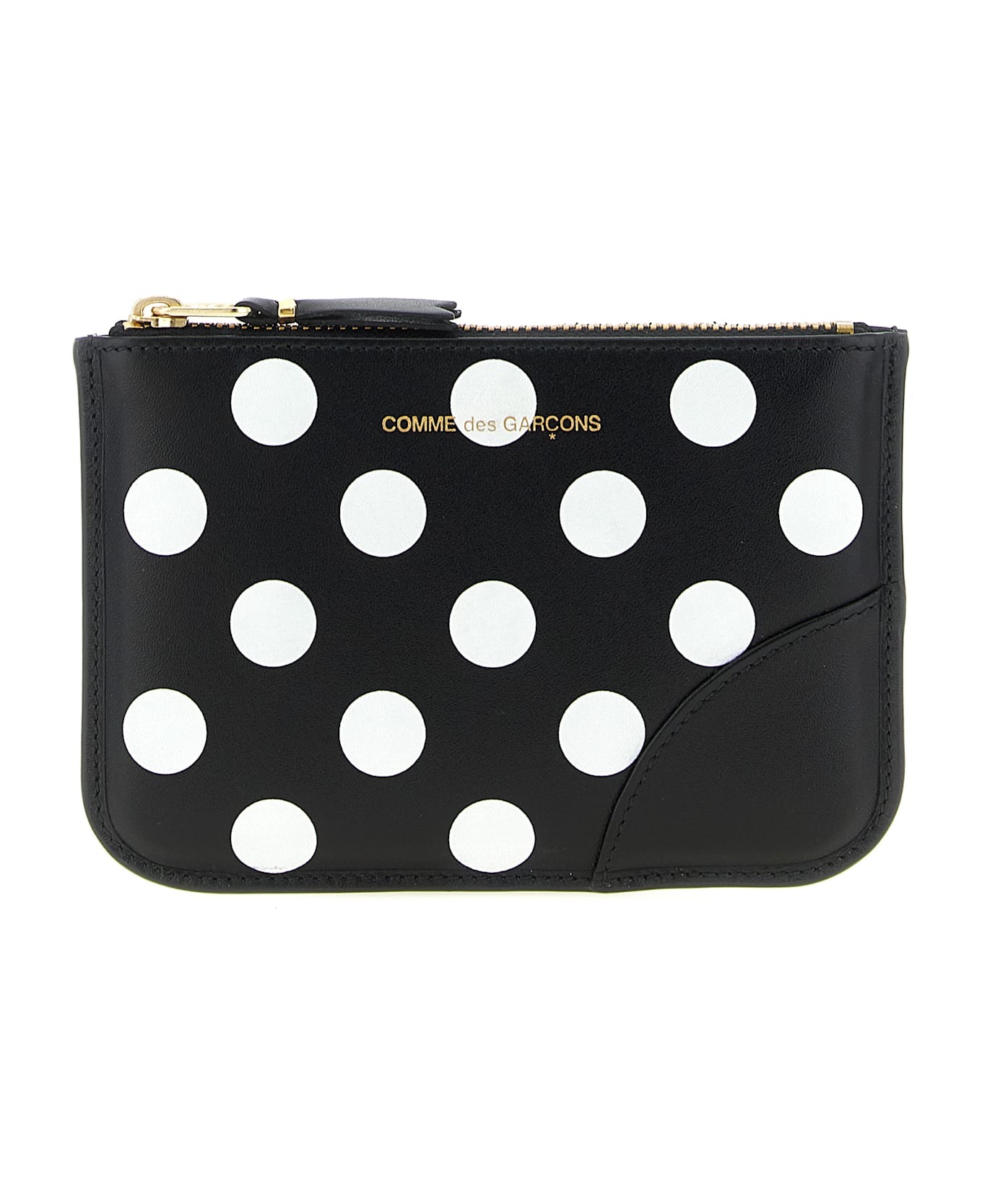 Polka Dots Printed leather card holder with polka dot print, top zip closure, embossed logo on the front.