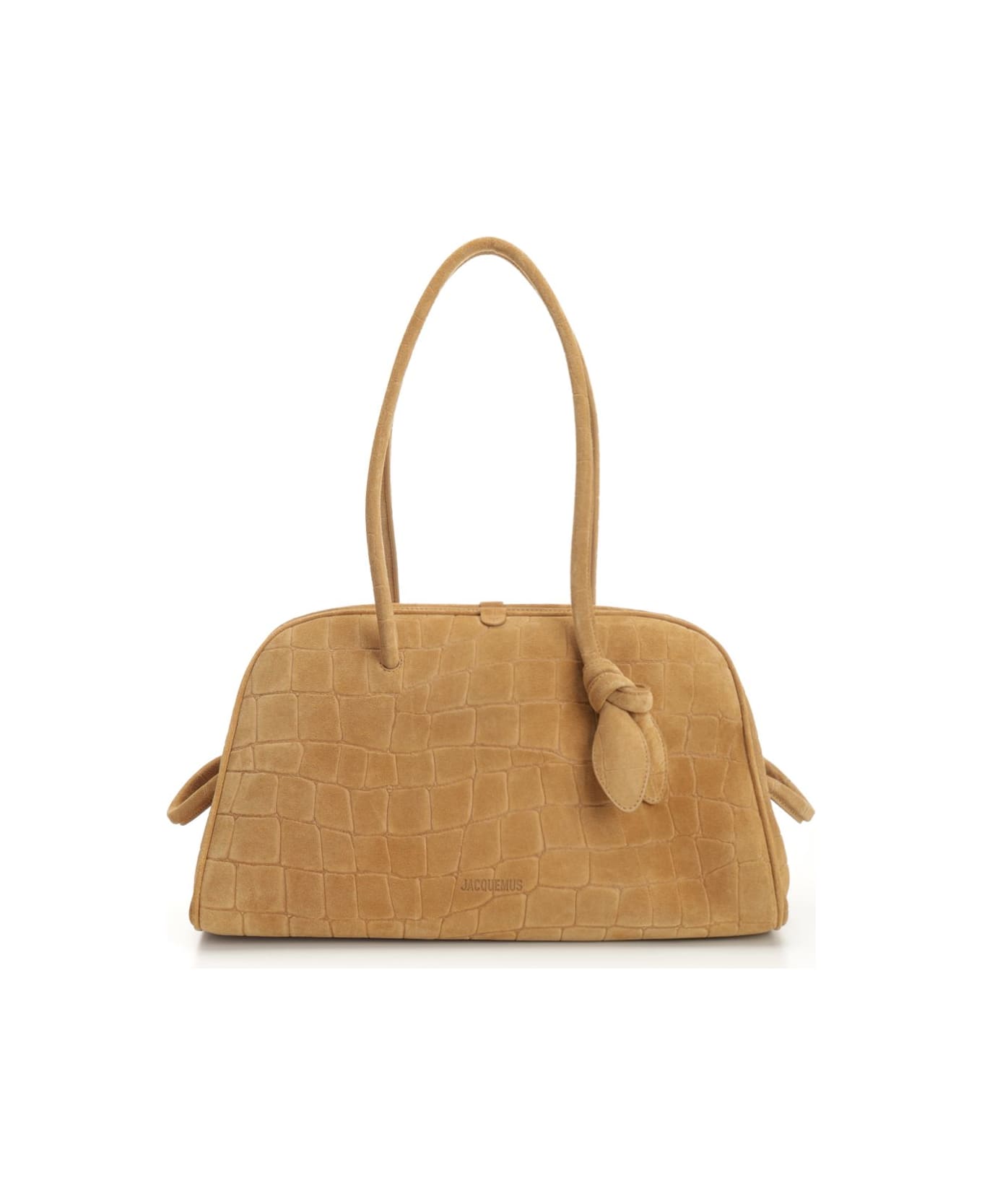 Embossed suede bowling bag Two-way zip closure Interior zip pocket Large patch pocket Bow detail