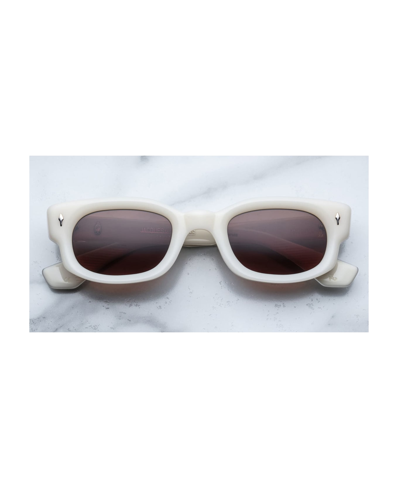 Jacques Marie Mage WHISKEYCLONE - LOTUS (JMMWC-8X) are '90s-inspired medium-sized rectangular sunglasses. They feature white 10mm cured cellulose acetate frame, custom double laminated temples, silver signature arrowhead front pins, exposed wirecore decoration, tension-secured custom 7 barrel hinge, brown 2 base CR39 lens with backside anti-reflective treatment with 100% UV protection.