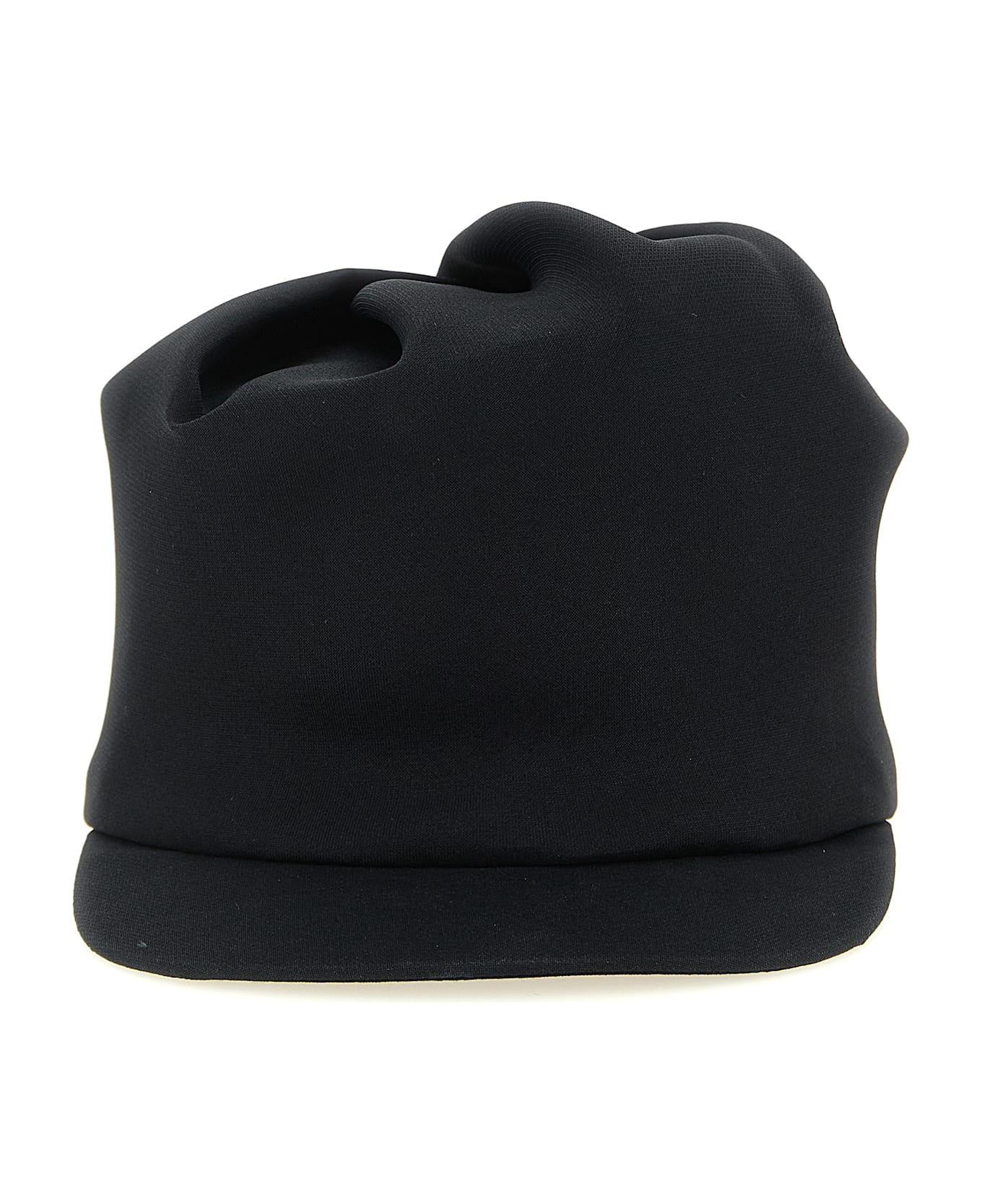 Silk cap with visor, front convex closure and rigid sculptural detail as a rear scarf. Composition: 100% silk
