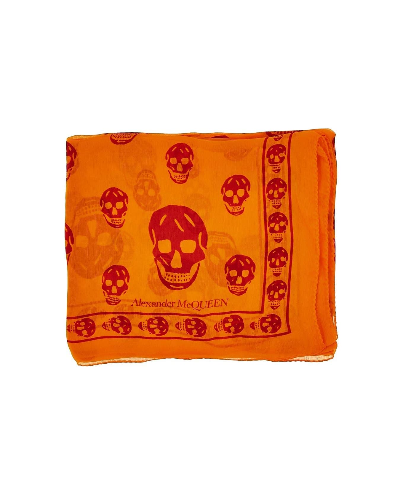 Alexander McQueen scarf in orange silk with skulls pattern. The item is featured by logo print and finished edges. Composition: SE