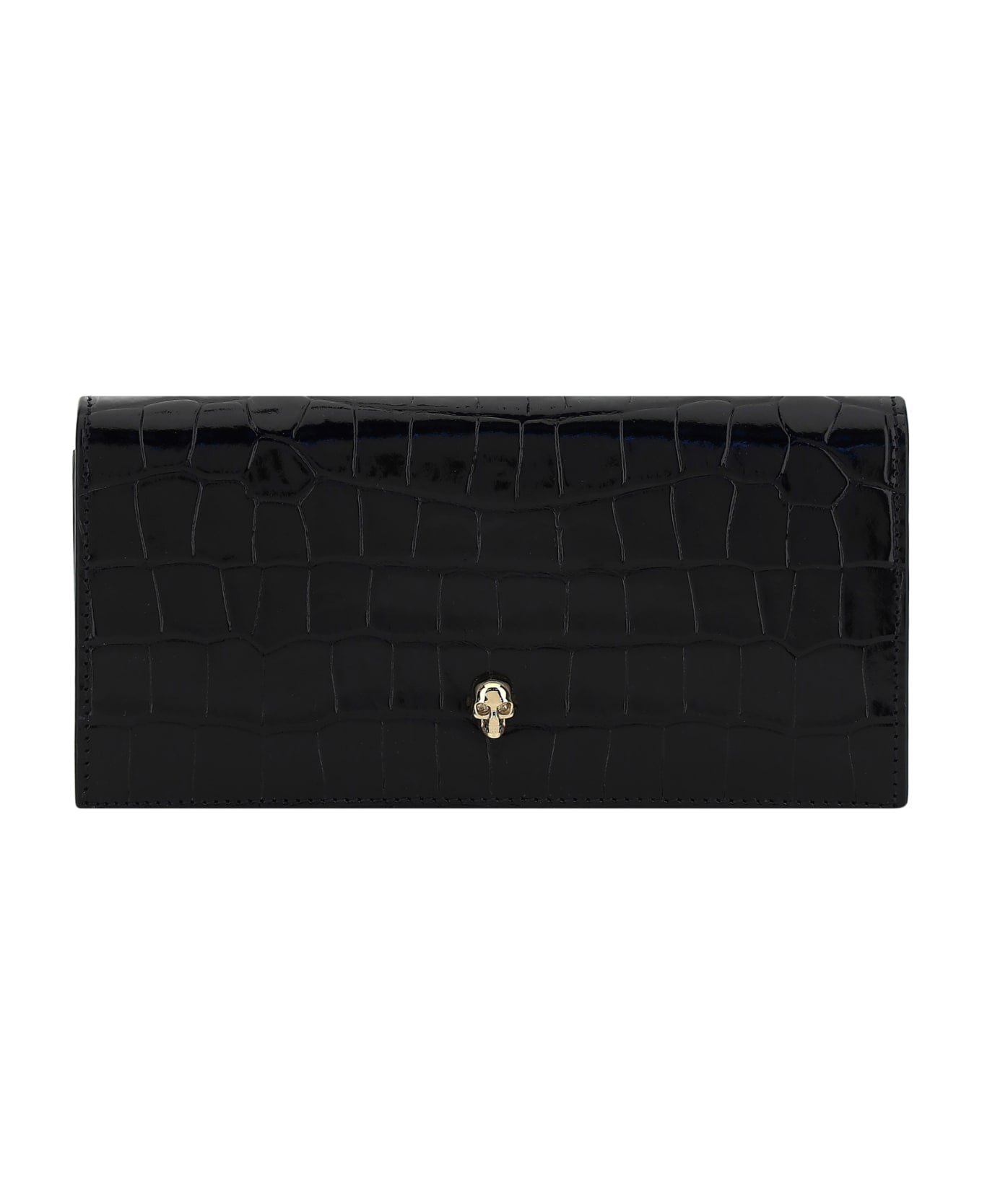 Calfskin chain wallet by alexander mcqueen, front snap-button closure, crocodile-effect patent leather design, iconic embossed brand skull plaque on front, interior bill compartment, interior card slots, zippered coin pocket for closure, removable chain shoulder strap.