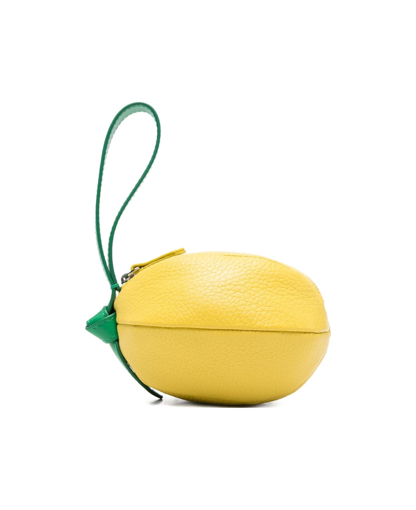 yellow grained texture top zip fastening wrist strap green leaf detail This piece comes complete with a protective dust bag.