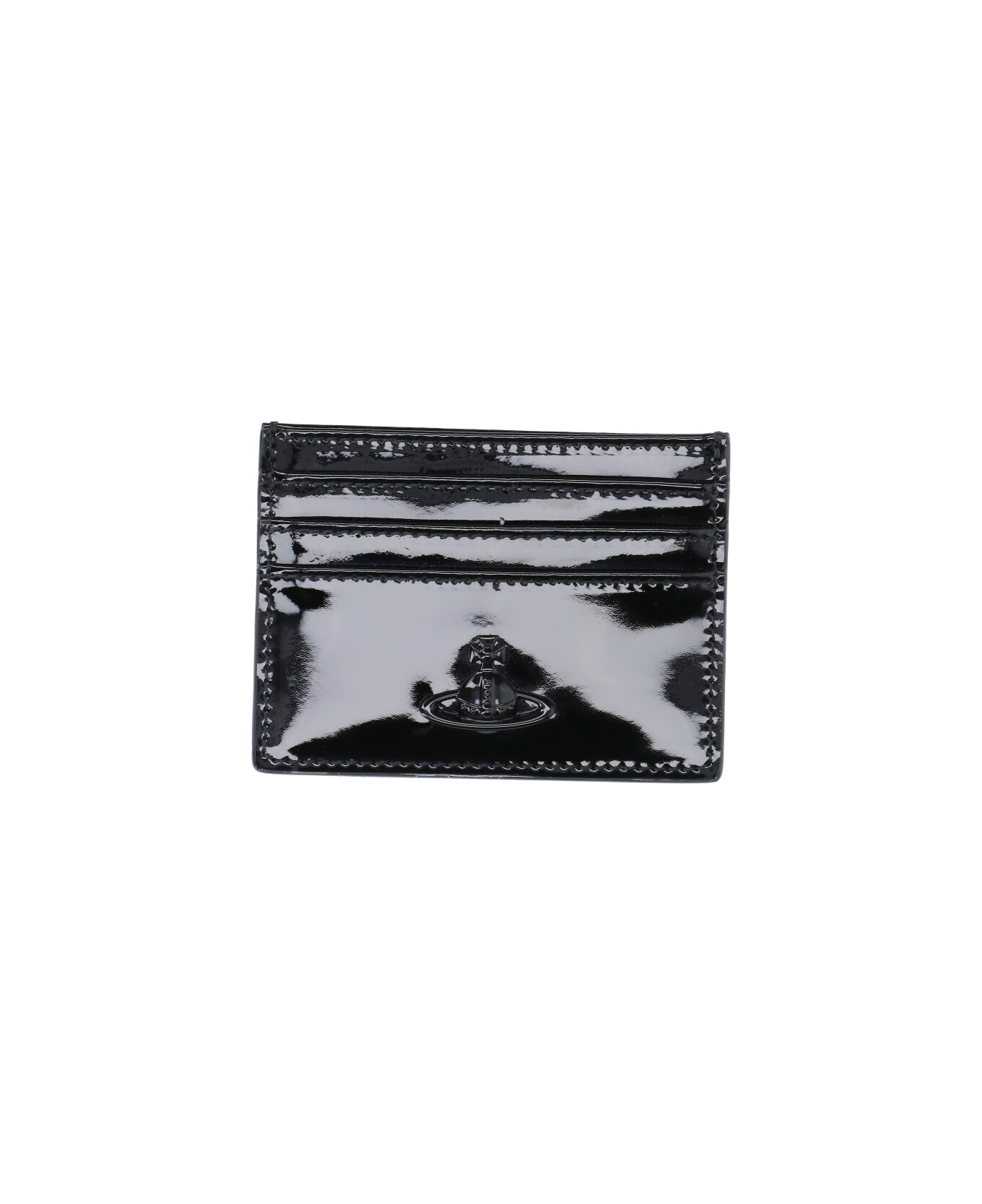 Vivienne Westwood 'Orbit' card holder in black patent leather with one central flat pocket, four card slots, tonal 'Orb' logo on the front. Composition: 100% Calf Leather