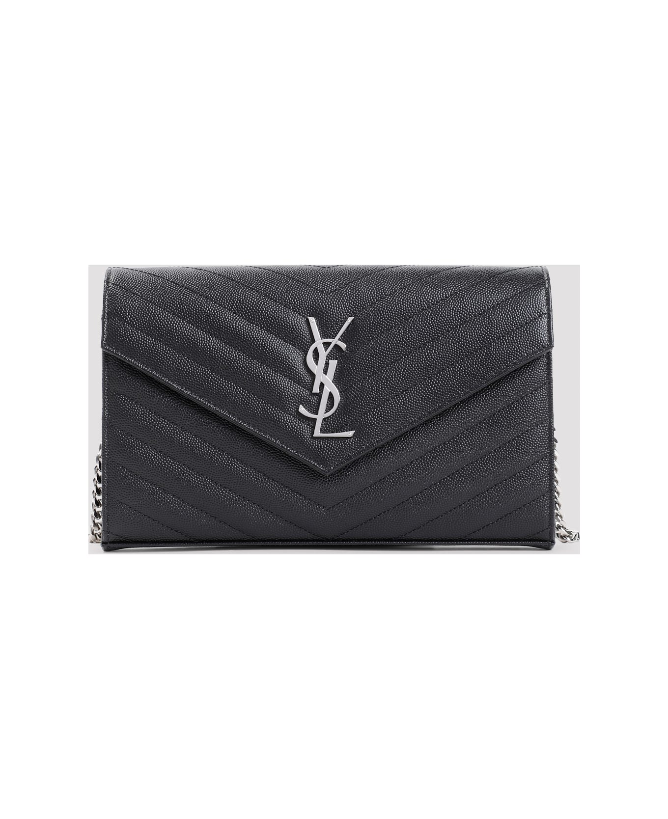 Saint Laurent YSL Black Chain Matelassé Leather Wallet. Crafted from matelassé leather, signature chevron quilting, silver-toned hardware, front metal Cassandre logo, concealed magnetic closure, inner leather lining, ten internal card slots, one bill slot, two central compartments and one zipper pocket, detachable chain shoulder strap.