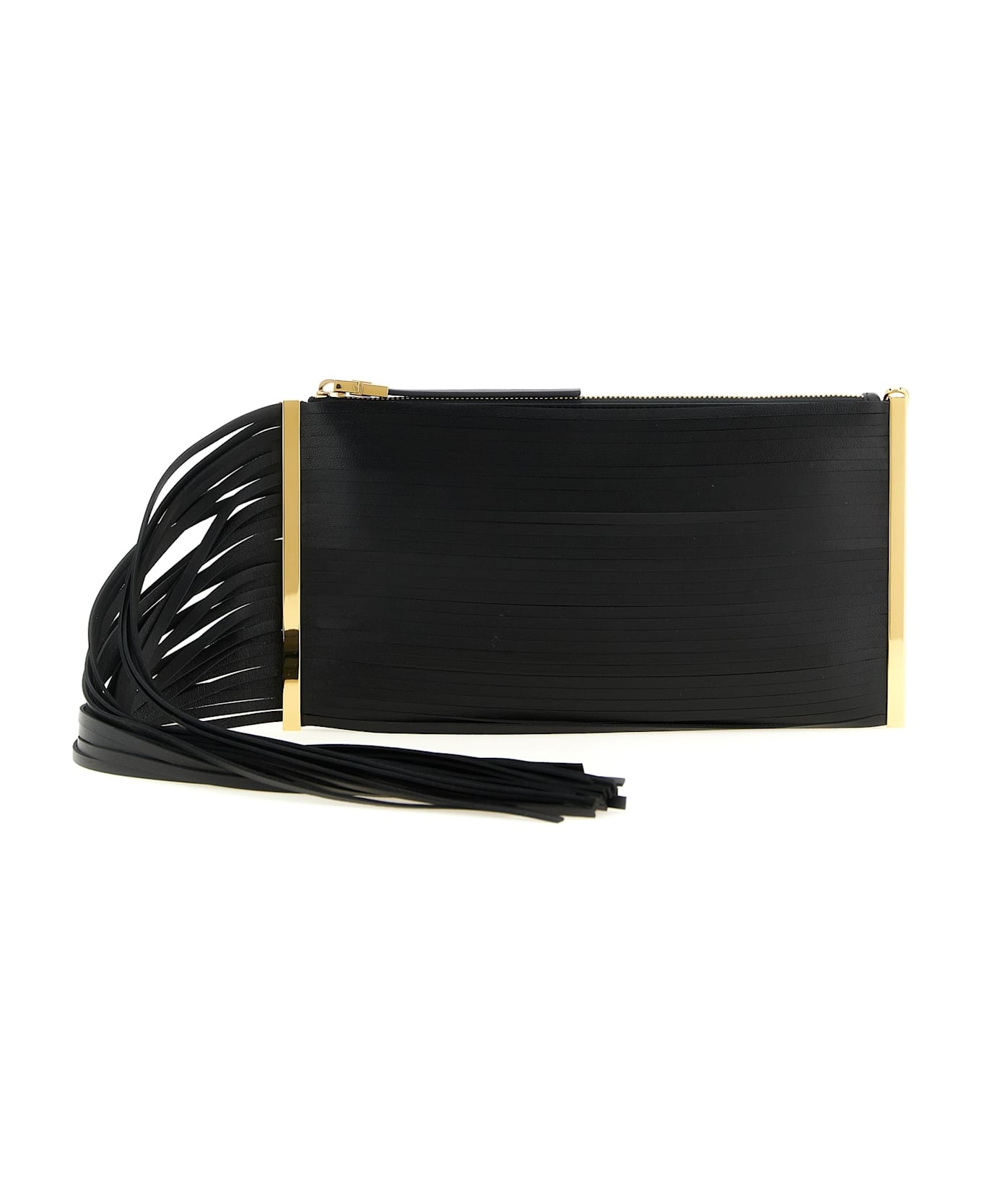Leather clutch bag, fringes falling on the right side, side metal details, top zip closure, back embossed logo, removable chain shoulder strap.