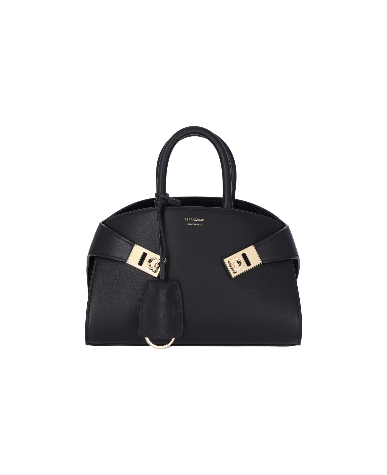 Ferragamo Hug mini bag in black hammered leather with gold metal details, two rigid top handles, removable ring keyring detail, adjustable and removable shoulder strap, gold logo print on the front, Gancini buckle turn-up closure, main inner compartment, two interior flat pockets, and feet on the bottom.