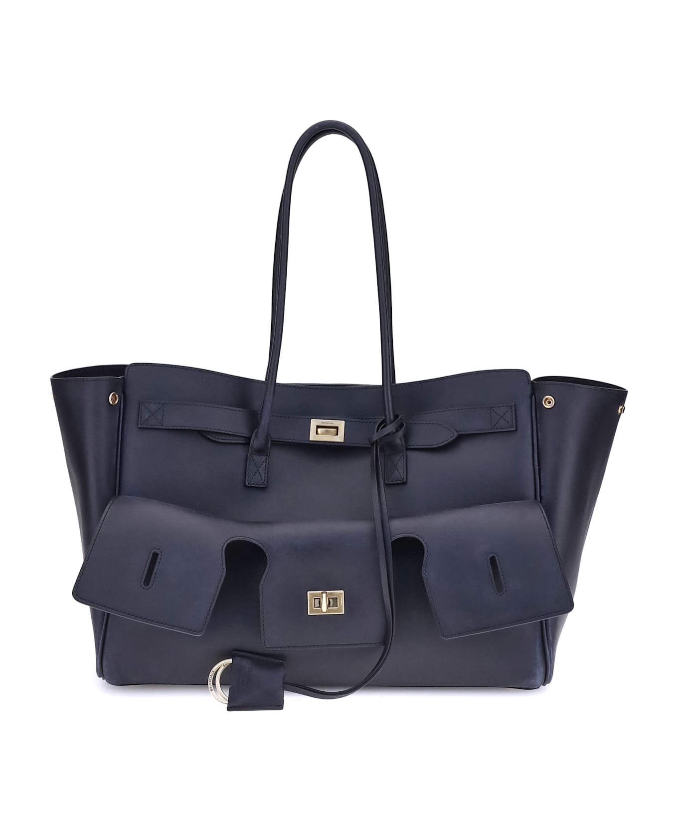 The medium bel air shoulder bag by balenciaga combines elegance and functionality in a modern design. carried by hand or on the shoulder thanks to the two handles, it is embellished with the balenciaga paris logo embossed with silver lamination and with antiqued metal details. the removable key ring and the twist lock with belts give character and practicality. complete with a large front pocket, an open main compartment and internal pockets with and without zips, it offers impeccable organization for all your daily needs.
