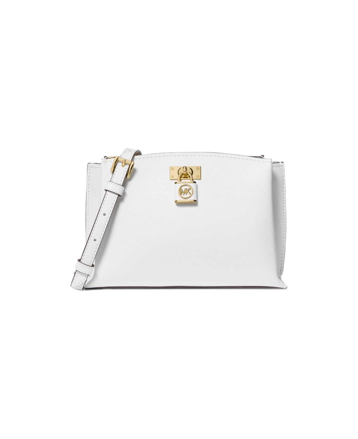 Ruby shoulder bag by Michael Kors made of white saffiano leather, embellished with logo detail with padlock and golden hardware. Lined interior, equipped with two compartments with magnetic closure and a partition with zip. Adjustable and removable shoulder strap with chain insert, measures 23x16. 5x9. 5 cm.