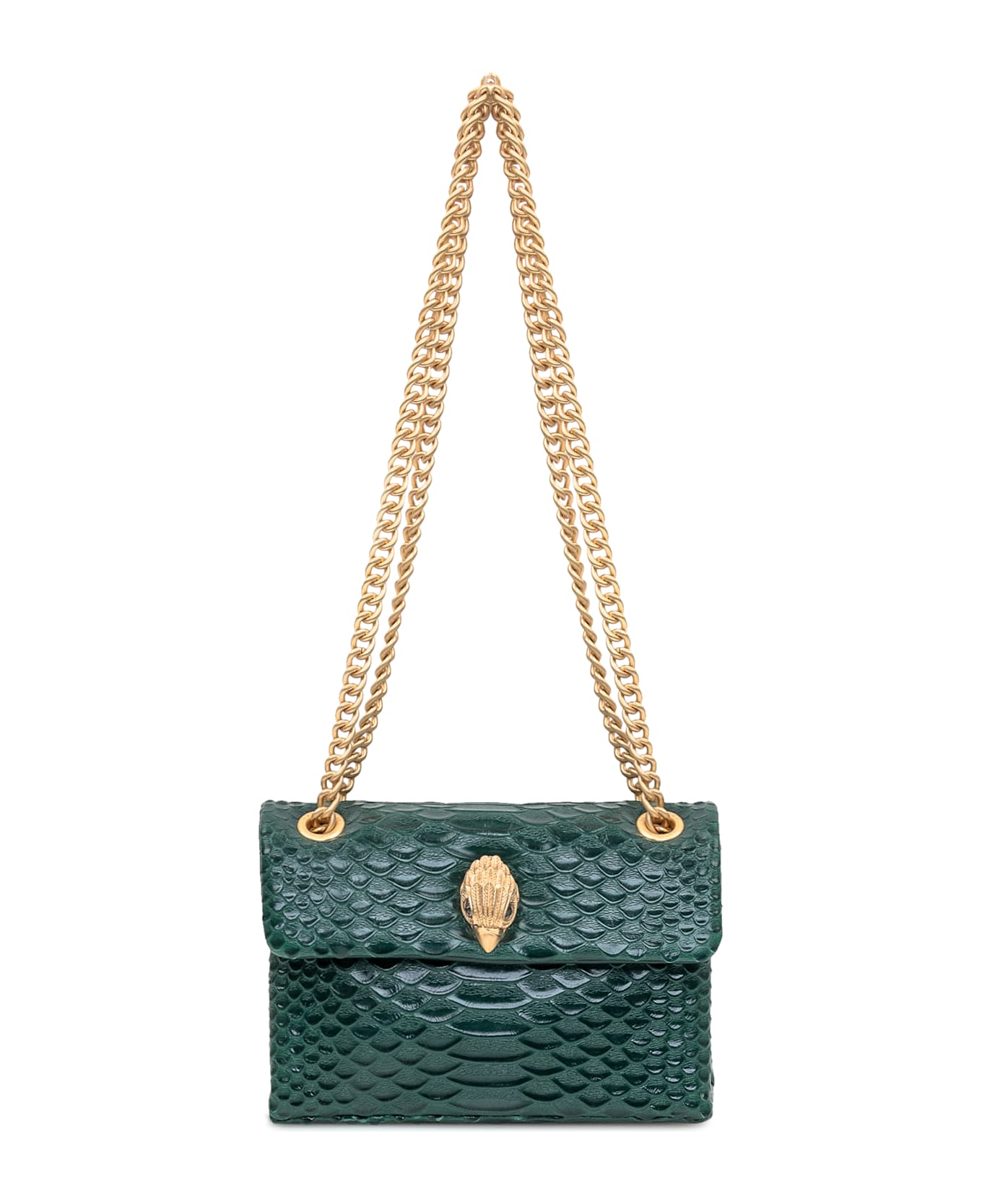 Green leather shoulder bag. Python pattern. Interior compartment with card pocket. Logo tag on the back. Eagle head applied. Button closure.