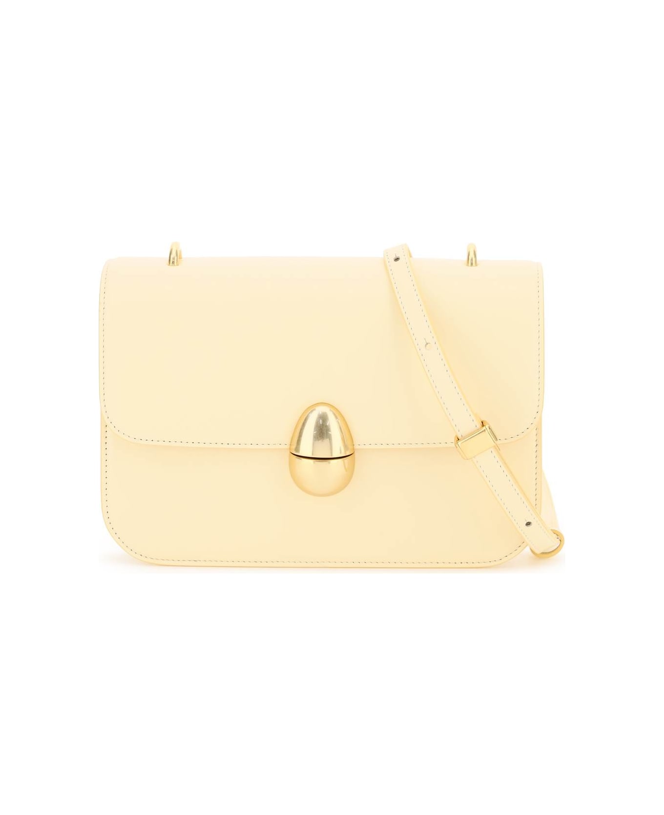 Phoenix shoulder bag by NEOUS made of smooth leather featuring a magnetic closure with a spherical shape. Leather interior with a flat open pocket, adjustable shoulder strap to be worn on the shoulder as well, and gold-finished metalware.