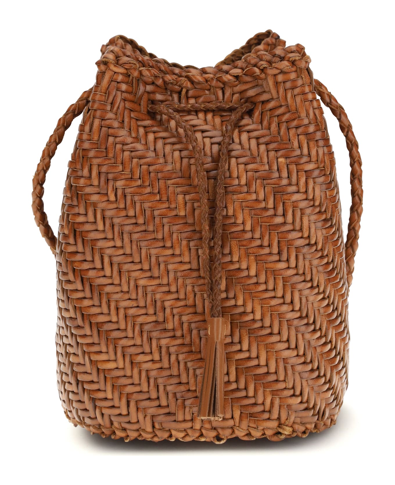 The pompom double jumps bucket bag by dragon diffusion is a unique accessory made of hand-woven buffalo calfskin. unlined, its simple yet elegant design is enhanced by a leather shoulder strap for optimal comfort. inside, each bag is decorated with a pendant in the shape of an antique st. christopher medal, a symbol of protection for travelers. a model that combines craftsmanship, functionality and a touch of tradition, perfect for adding style to any look.