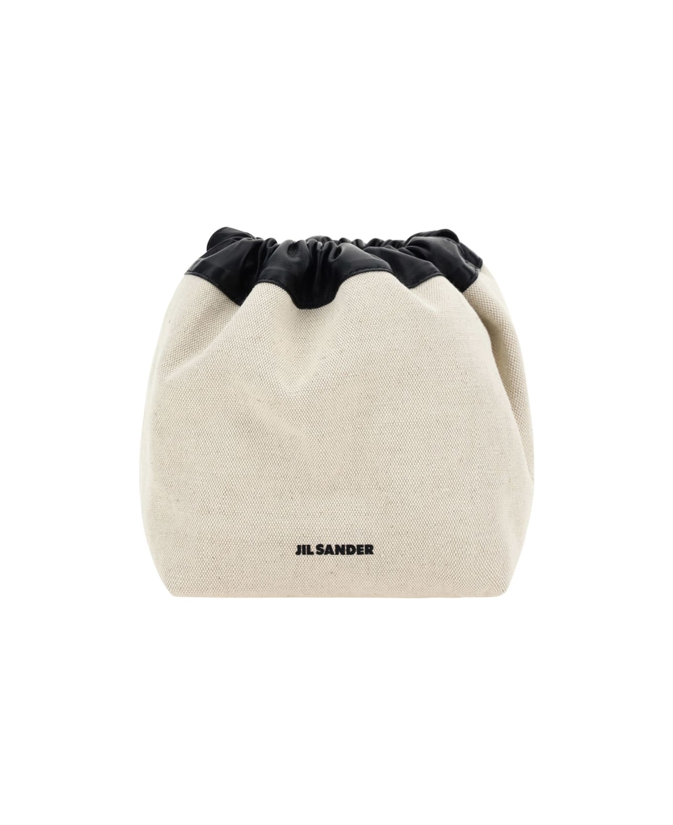 Cotton shoulder bag by jil sander, contrasting drawstring top closure, double thin shoulder strap with leather detail, interior welt pocket with brand signature, leather lining, iconic brand monogram on front in contrast. Composition: 70% % Cotton, 30% % Linen