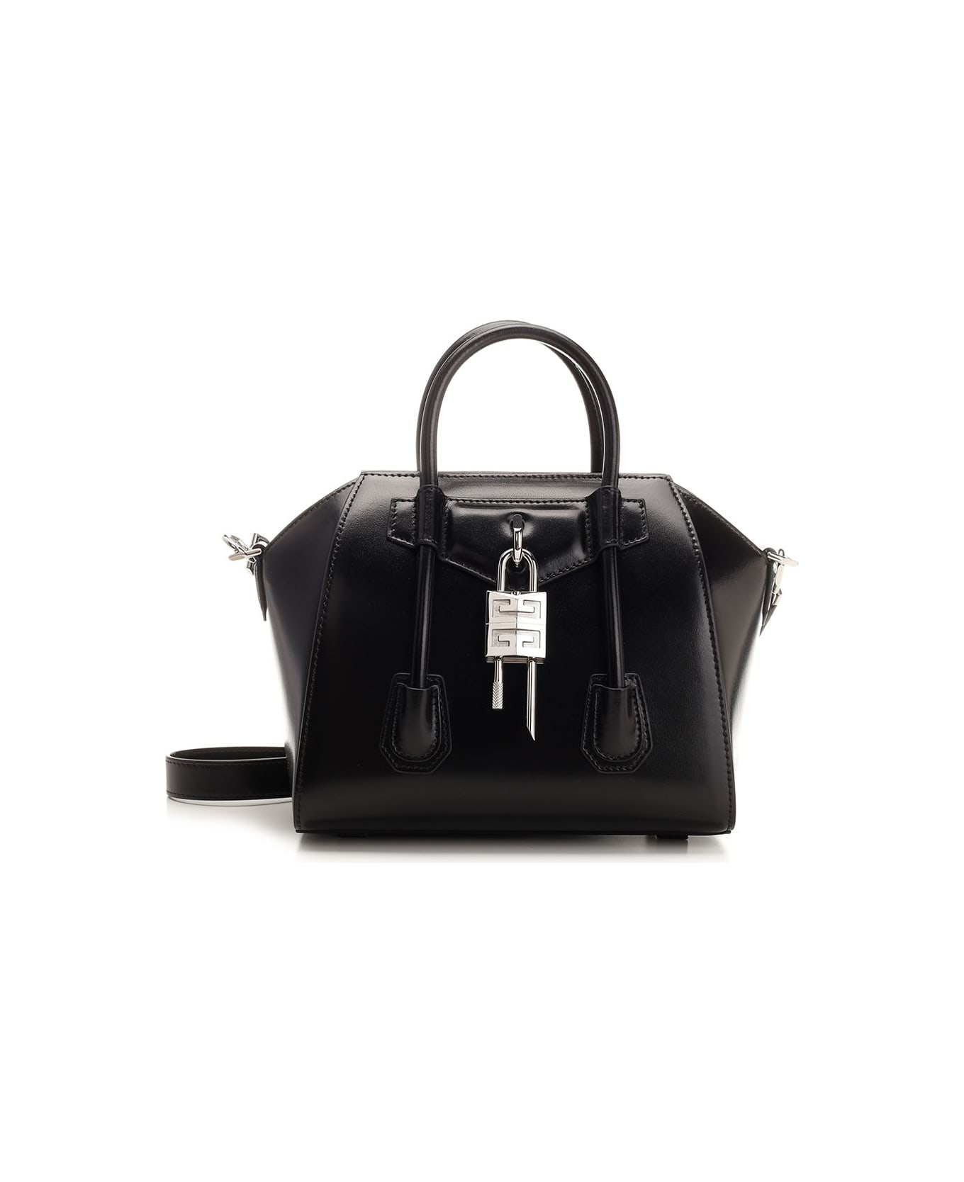 "Antigona Lock" mini bag in Box calfskin from Givenchy, with magnetic closure, pentagonal application with removable 4G padlock on the front, pentagonal application with embossed 4G logo on the back, adjustable and removable leather shoulder strap, silver-finish metal details, one main compartment, one flat pocket and one flat zip pocket inside.