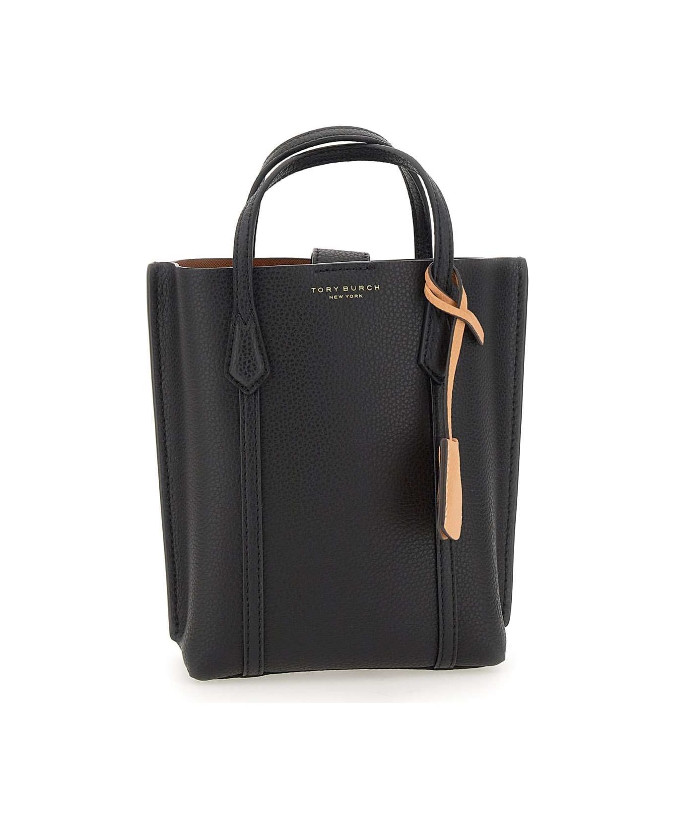 Tory Burch "Mini Perry Tote" handbag in hammered leather, black, top leather handles, gusset and snap button fastening, logo print on the front panel, removable leather tag with key ring, 112cm removable and adjustable leather shoulder strap, gold-finish metal accessories, two internal leather compartments, one central slot compartment, dust bag included. Dimensions: height 17cm, width 13cm, depth 6cm.