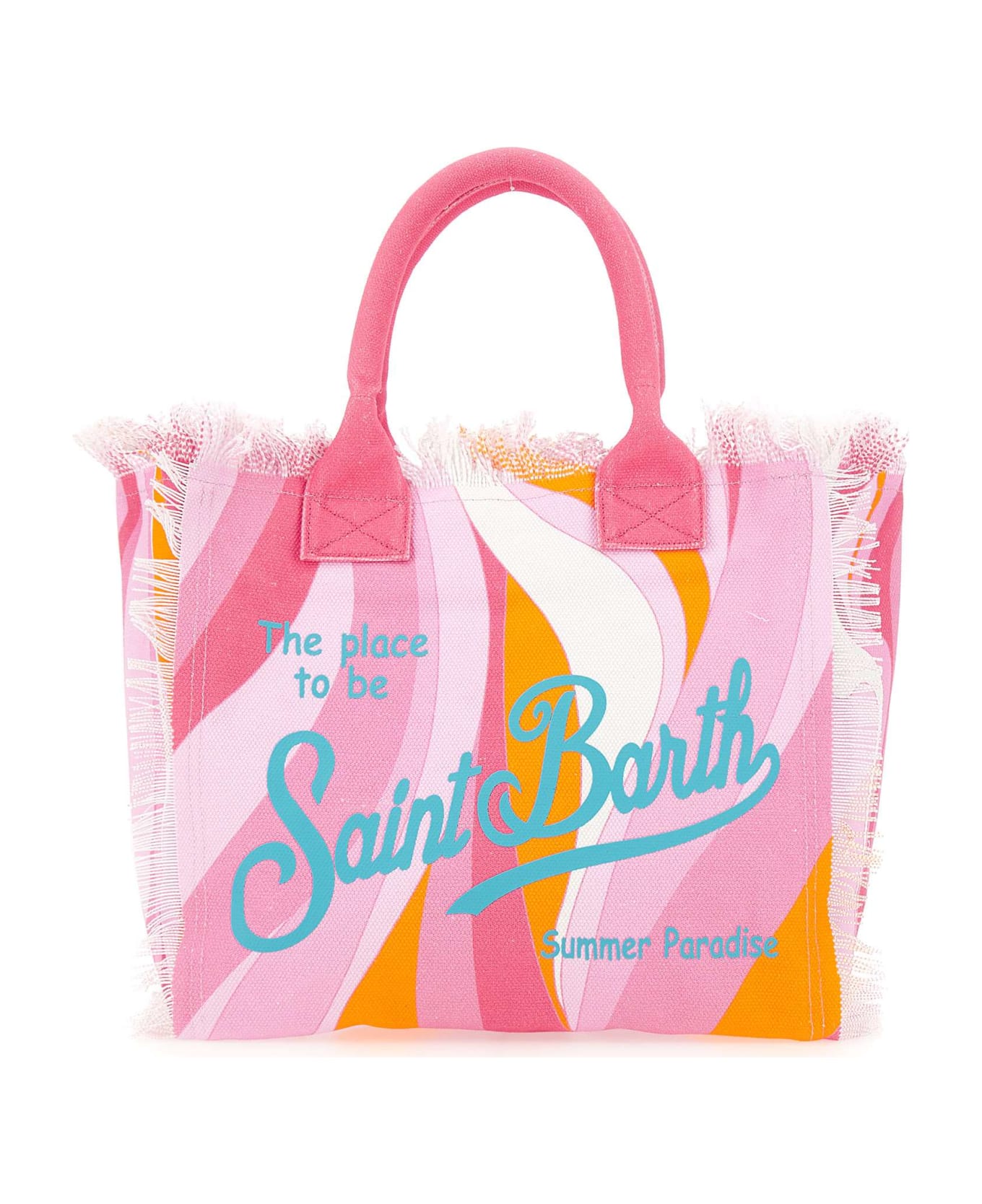 Mc2 Saint Barth "Vanity Summer Paradise" cotton canvas handbag, optical pattern shades of pink, orange and white, double top handle, fringe detail, top zip fastening, single internal compartment, internal zip pocket, pocket bag with logo, cotton lining, light blue maxi logo print on front and back. Dimensions: length 40cm, depth 20cm, height 32cm.