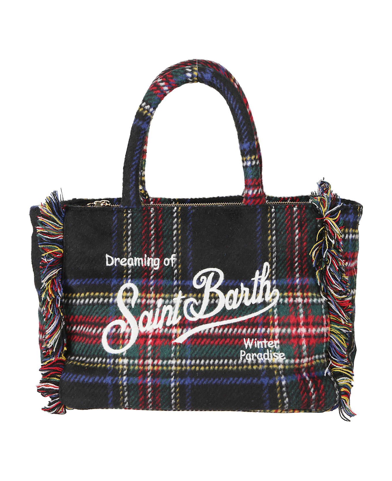 green and multicolour plaid pattern top handles fringe detailing zip fastening