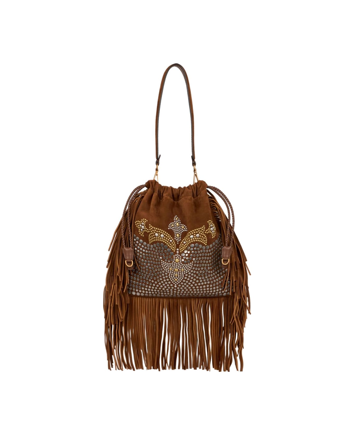 medium brown stud embellishments fringes braided drawstring top handle grained texture