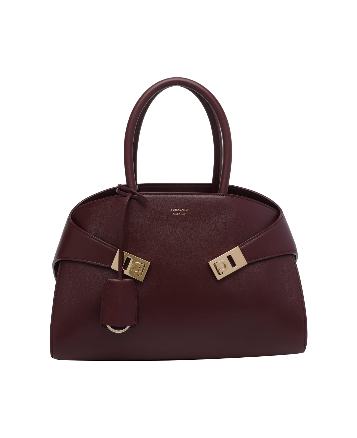 Ferragamo bordeaux Hug handbag, frog closure, inner zip pocket, 2 handles, adjustable and removable shoulder strap, logo on the front Composition: 100% Calf Leather