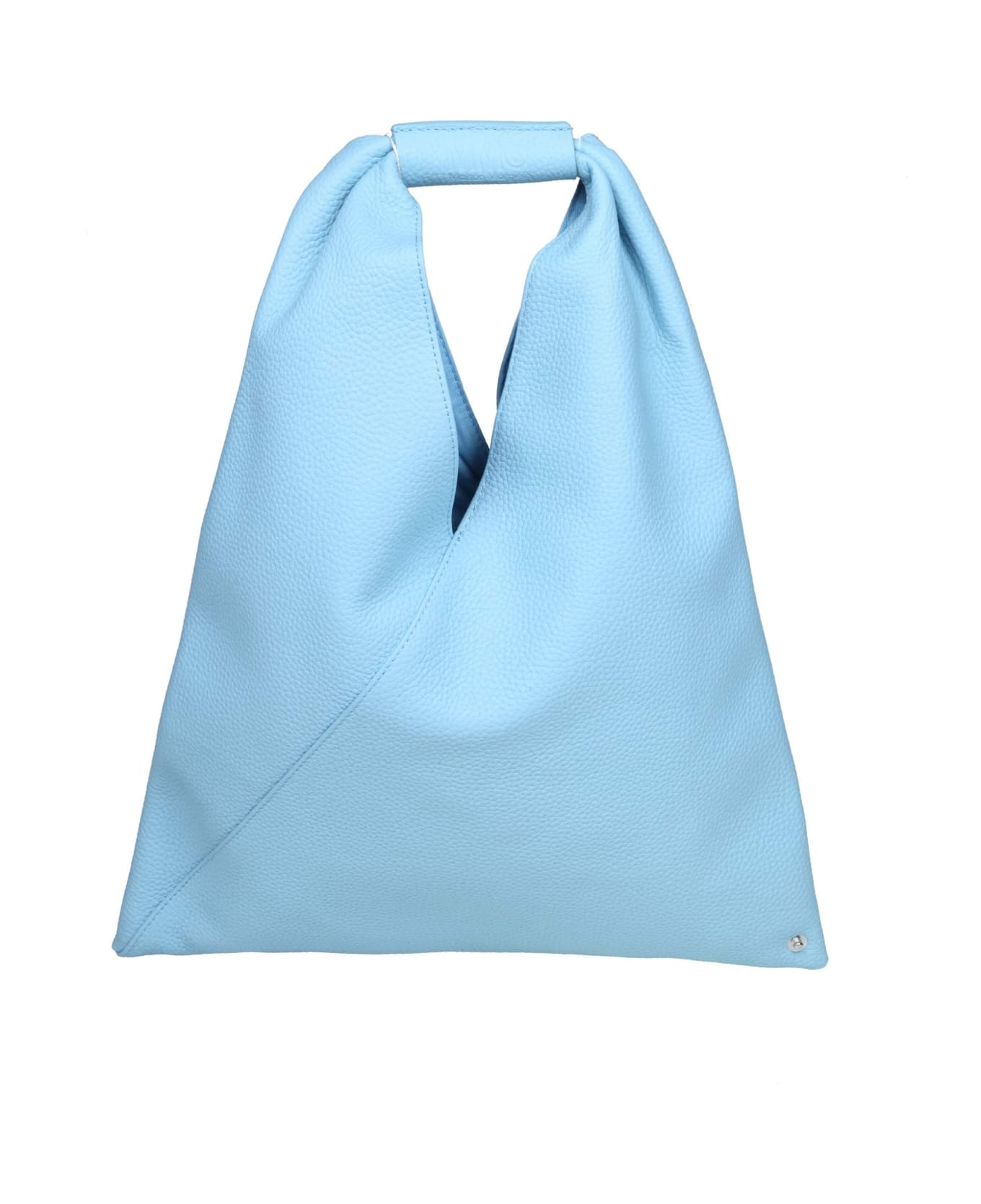 Handbag in textured leather light blue colour snap button closure reinforced handle fabric interior 1 inside pocket with snap button composition: 100% cow leather lining: 100% cotton dimensions: length 33. 5cm maximum height 39. 5cm minimum height 27cm depth 1cm