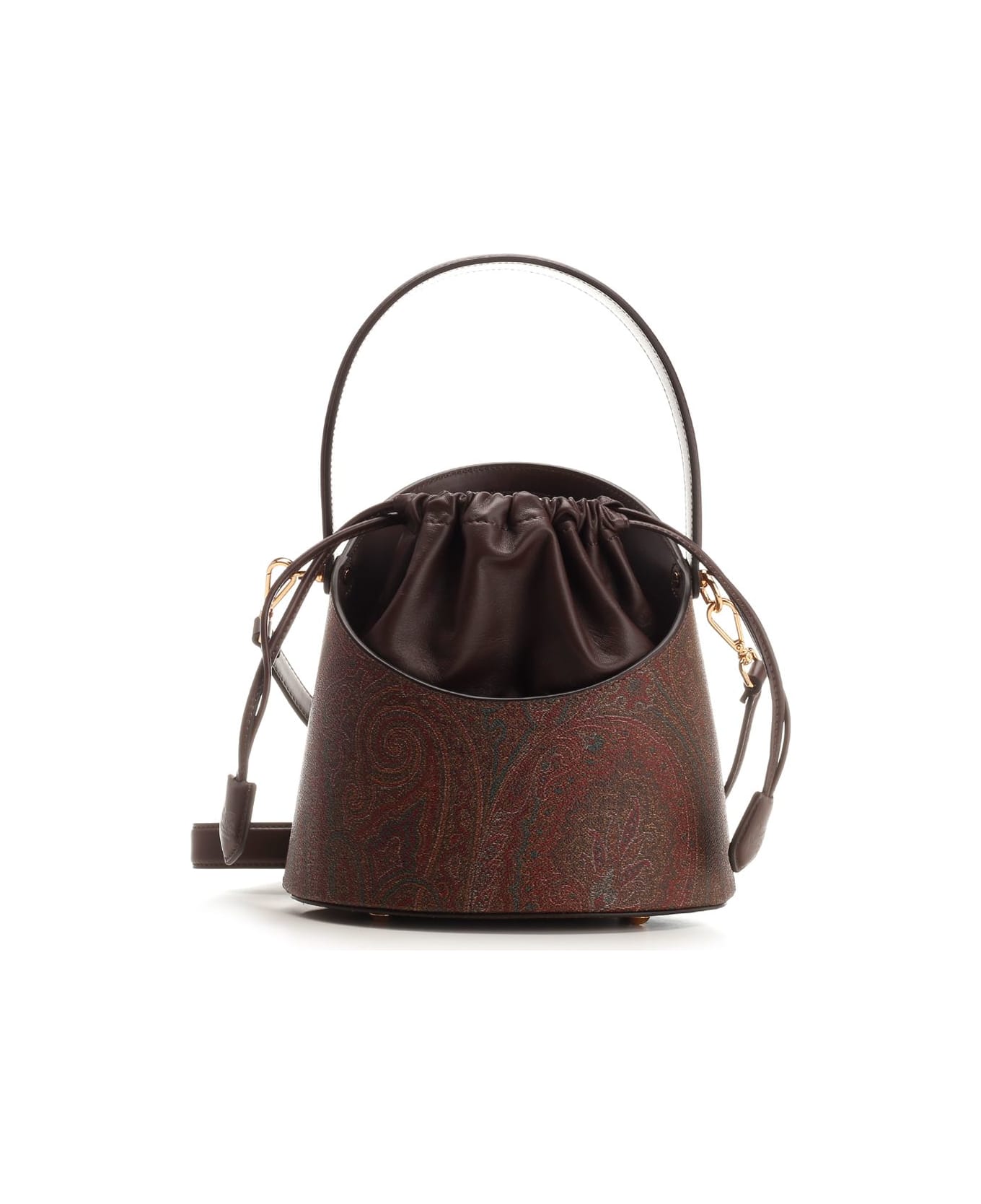 Medium "Saturno" bucket bag from Etro, in leather and the iconic Paisley jacquard fabric. Oval handle, internal body made of a bag with drawstring, striped internal lining, removable and adjustable shoulder strap, metal feet.