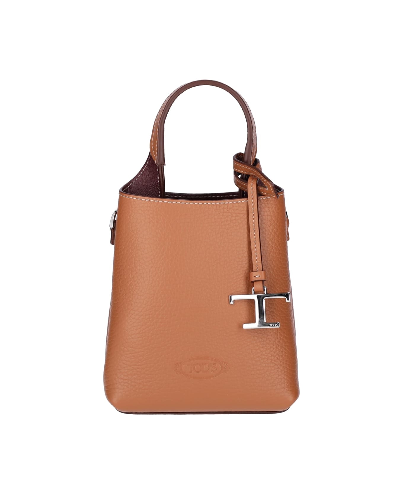 Micro bag in brown Tod s leather, one top handle, adjustable and removable shoulder strap, removable silver logo charm detail, embossed logo detail on the front, two interior compartments. Composition: 100% Leather