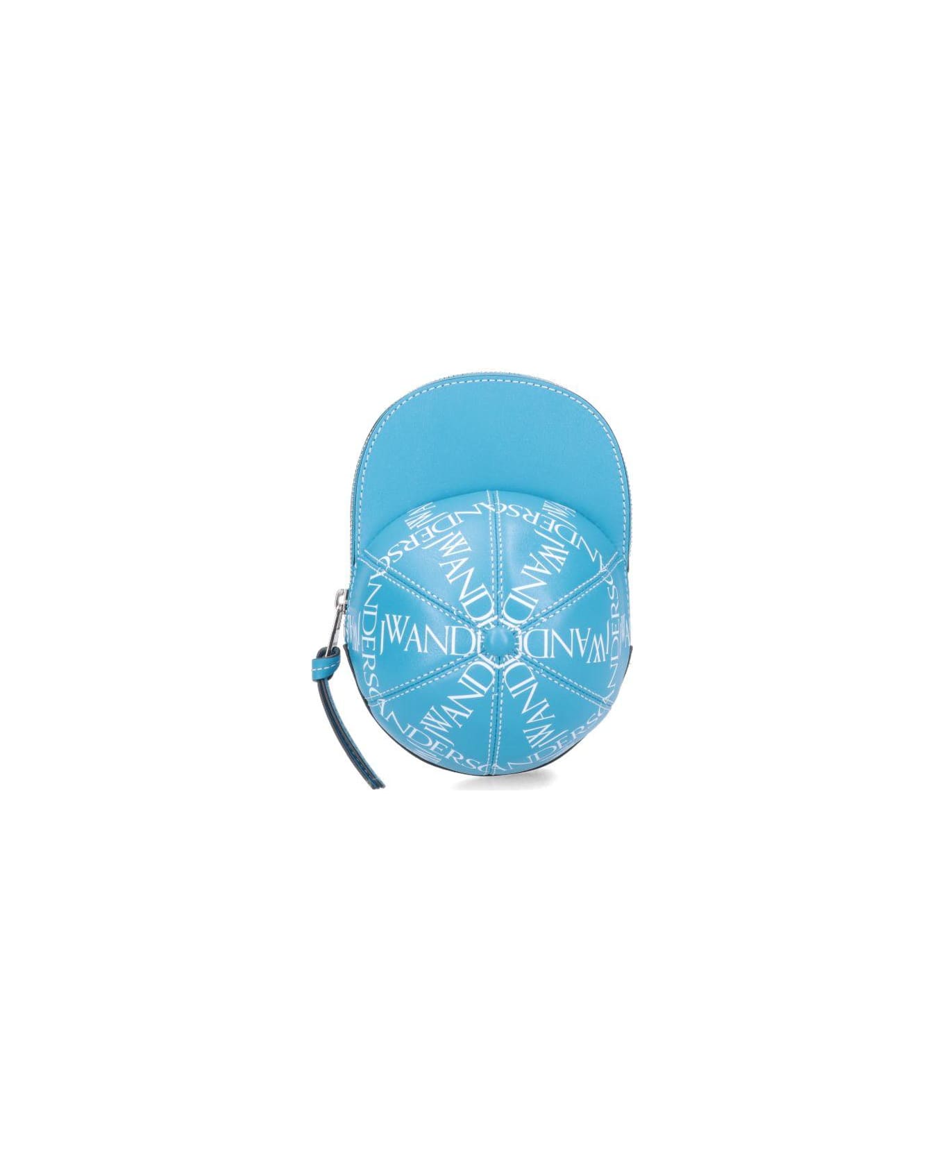 J. W. Anderson 'Midi Cap' Bag, metallic leather, light blue color, zipper closure, removable shoulder strap, all-over logo print white color, one interior compartment.