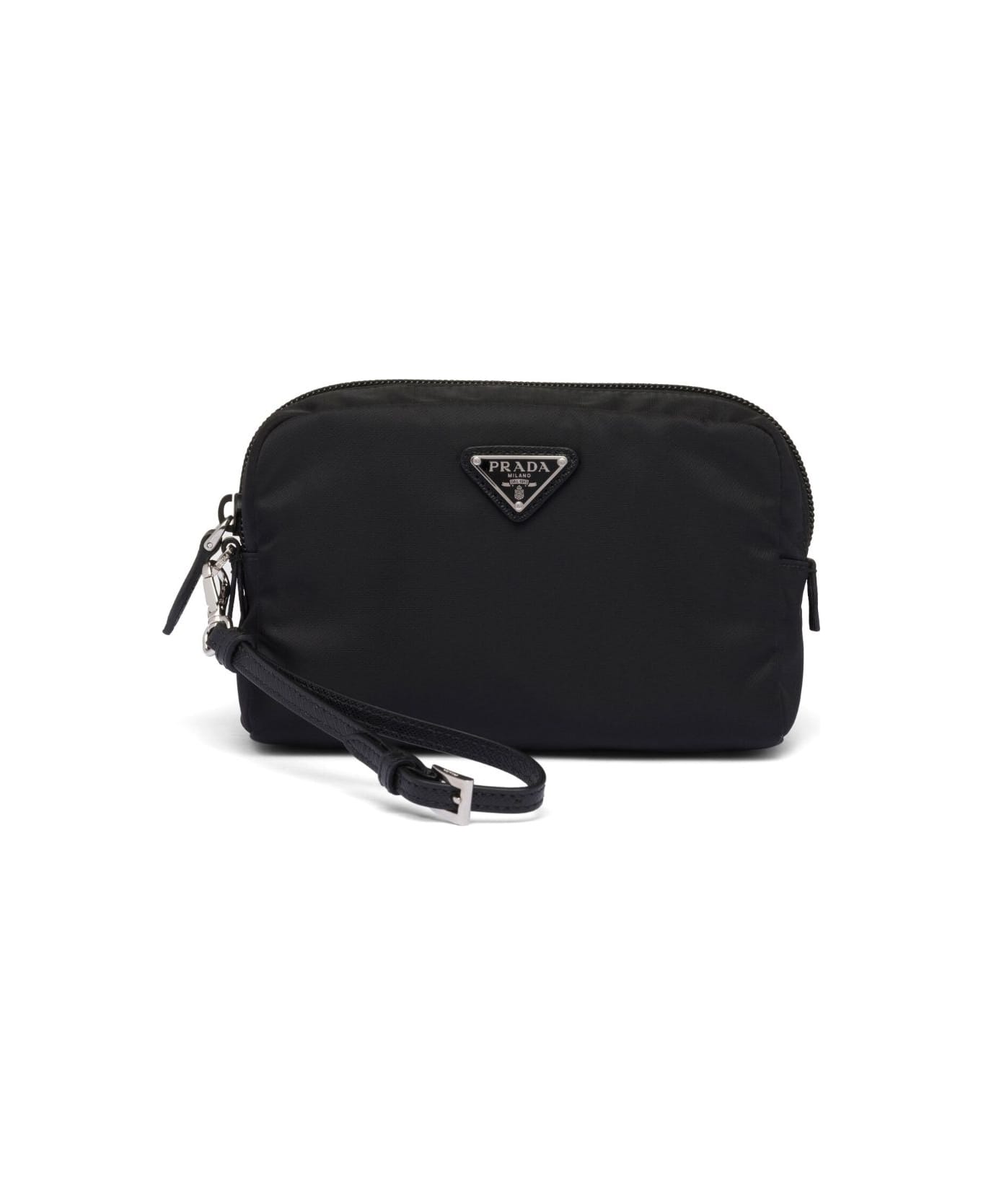 Our team selected this model for its high stylistic content and discreet impact. Prada Re-Nylon Pouch with Zip Features Black, enamel triangle with logo, top zip closure, wrist strap, and single compartment. . . Composition: 100% Poliammide Riciclata-, 100% Calf