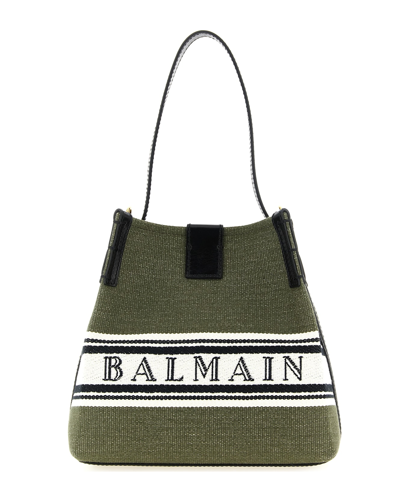 Release' canvas bucket bag with calf leather details, central decoration and front intarsia logo, trapezoid design, fixed handle, internal magnetic closure, rigid base, adjustable and removable shoulder strap.