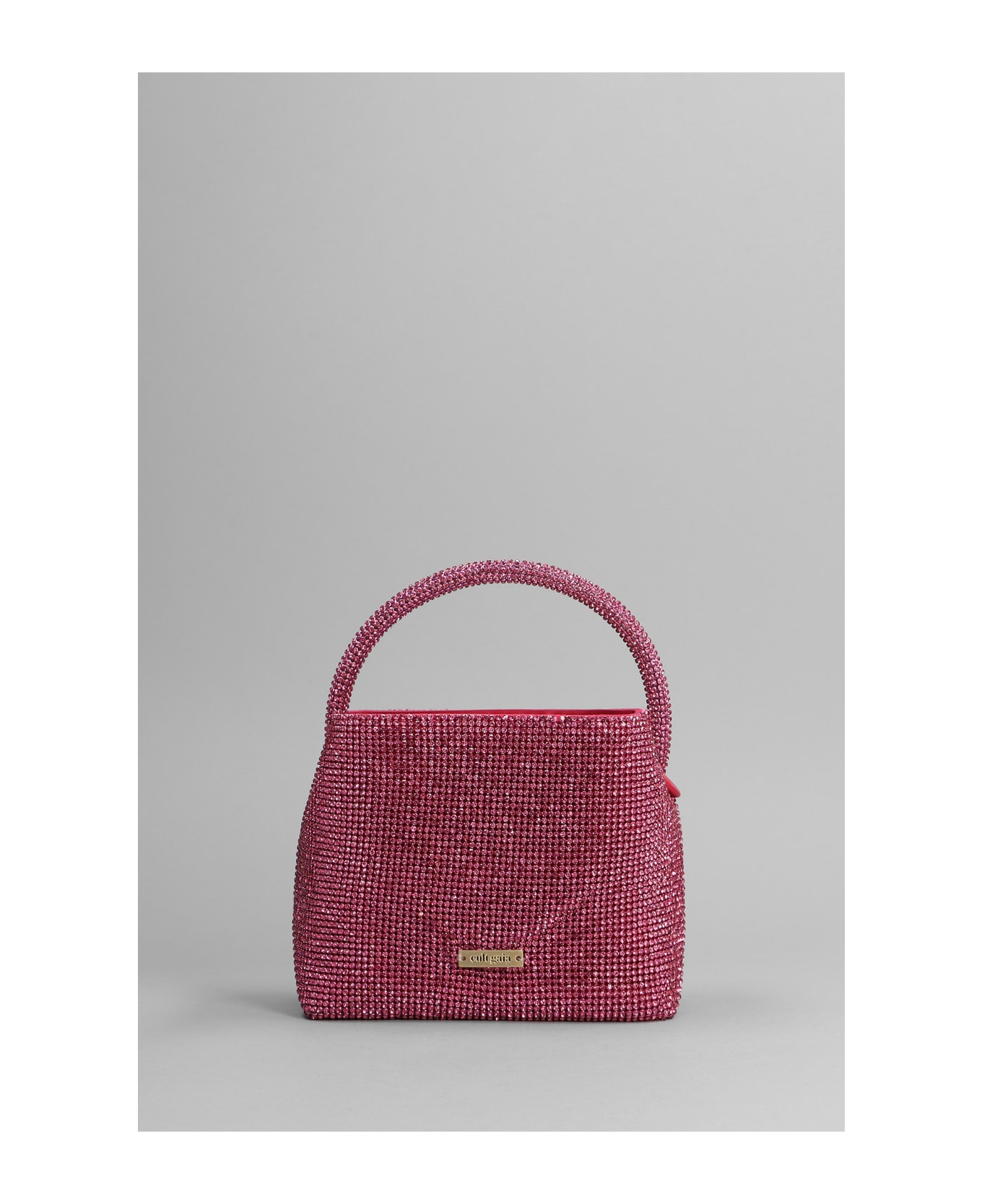Solene mini Hand bag in rose-pink synthetic fibers, Height 120 mm, Width 145 mm, Width 145 mm, hard top handle, magnetic closure, crystals detail, Made in China