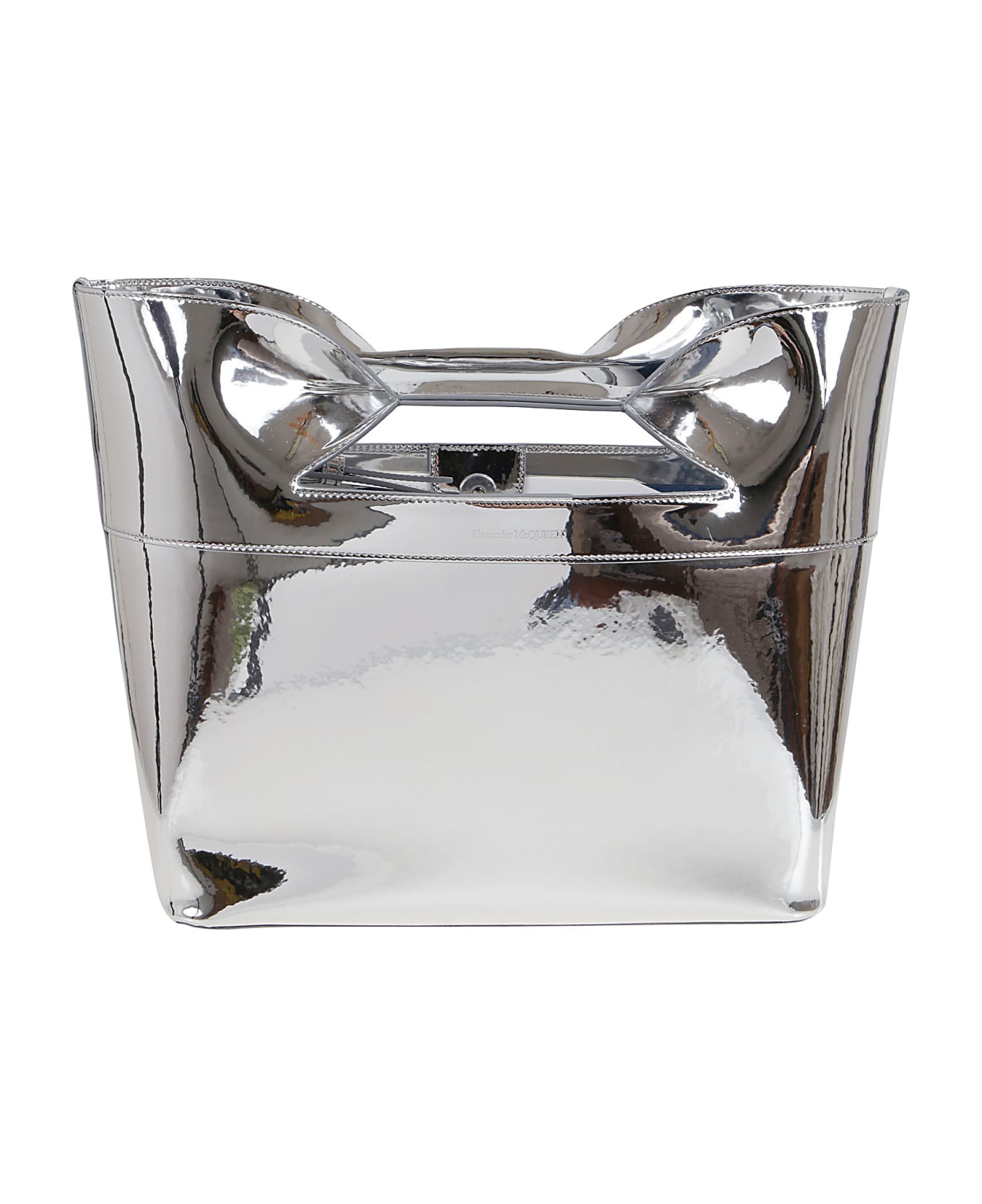 The BOW SMALL in calfskin BY ALEXANDER MCQUEEN. One main compartment, inside removable zip pouch with external card slot; magnetic closure. Twisted top handle. It can be carried both by hand and on the shoulder thanks to the internal shoulder strap.