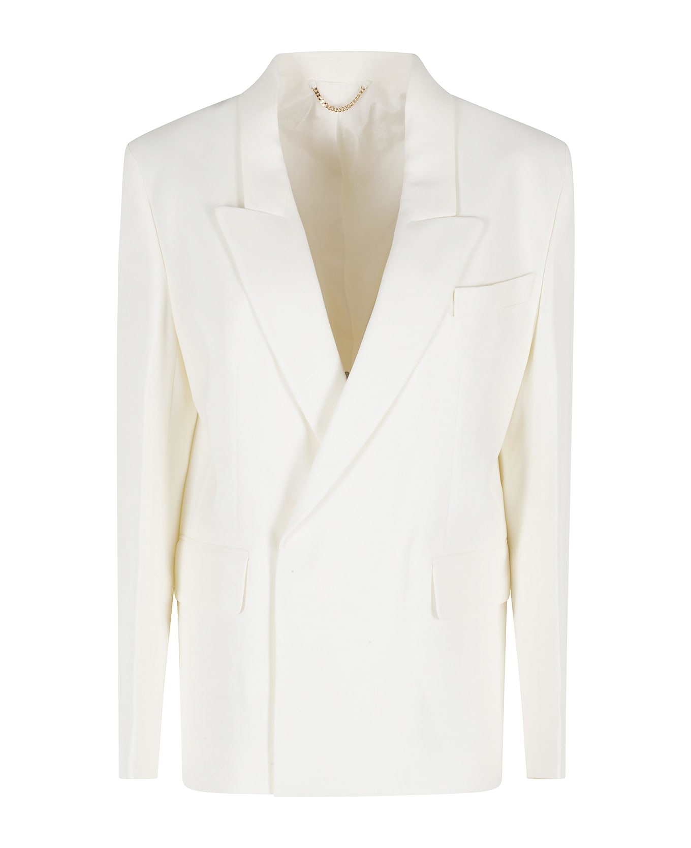 Category: Jacket - Blazer Item: Double-breasted blazer Brand: Victoria Beckham Color: White Neckline: Spear lapels Pockets: Chest pocket and two front flap Details: Side slits Closure: Double-breasted SIZE AND FIT Fit: Oversize Sleeve length: Long
